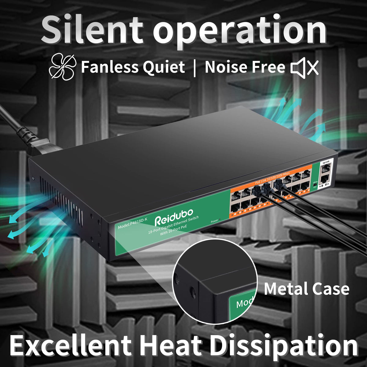 Reidubo Poe Switch With 16 1000M Poe Port + 2 1000M Uplink Port, 16 Poe Ports Providing Up To 30W Per Port, Total Poe Budget 250W. 2 Gigabit Ethernet Uplink Port For Connecting Nvr And Internet , Etc. Poe Switch 16 Port Have Professional Lightning Protection Design-Up 4Kv Port And Power Supply Thunder Prevents, With Two Levels Of Protection Design Respectively, Effectively Restrain The Power Of Lightning From Cable, Which Equivalent To Give The Entire Network Monitoring System With A Security Fence. The Poe Port Will Intelligently Judge Whether The Device Connected To The Port Needs Power Supply. If It Is A Non-Poe Device That Does Not Need Power Supply, The Switch Will Not Supply Power To These Devices And Will Not Damage The Device. The Power Supply Is Located In The Poe Switch Body And Integrated With The Switch. It Is Simple And Light. After Connecting To Our Ac Power Cable, The Switch Can Transmit Power To The Equipment Connected To The Switch. The Fanless Design Makes Poe Switch Work Without Any Noise. Reidubo Poe Switch Is Stable And Has Strong Anti-Interference Ability, Protect The Fault Caused By The Short Circuit Of The Network Port.Short Circuit, Over Current And Over Voltage Protection.