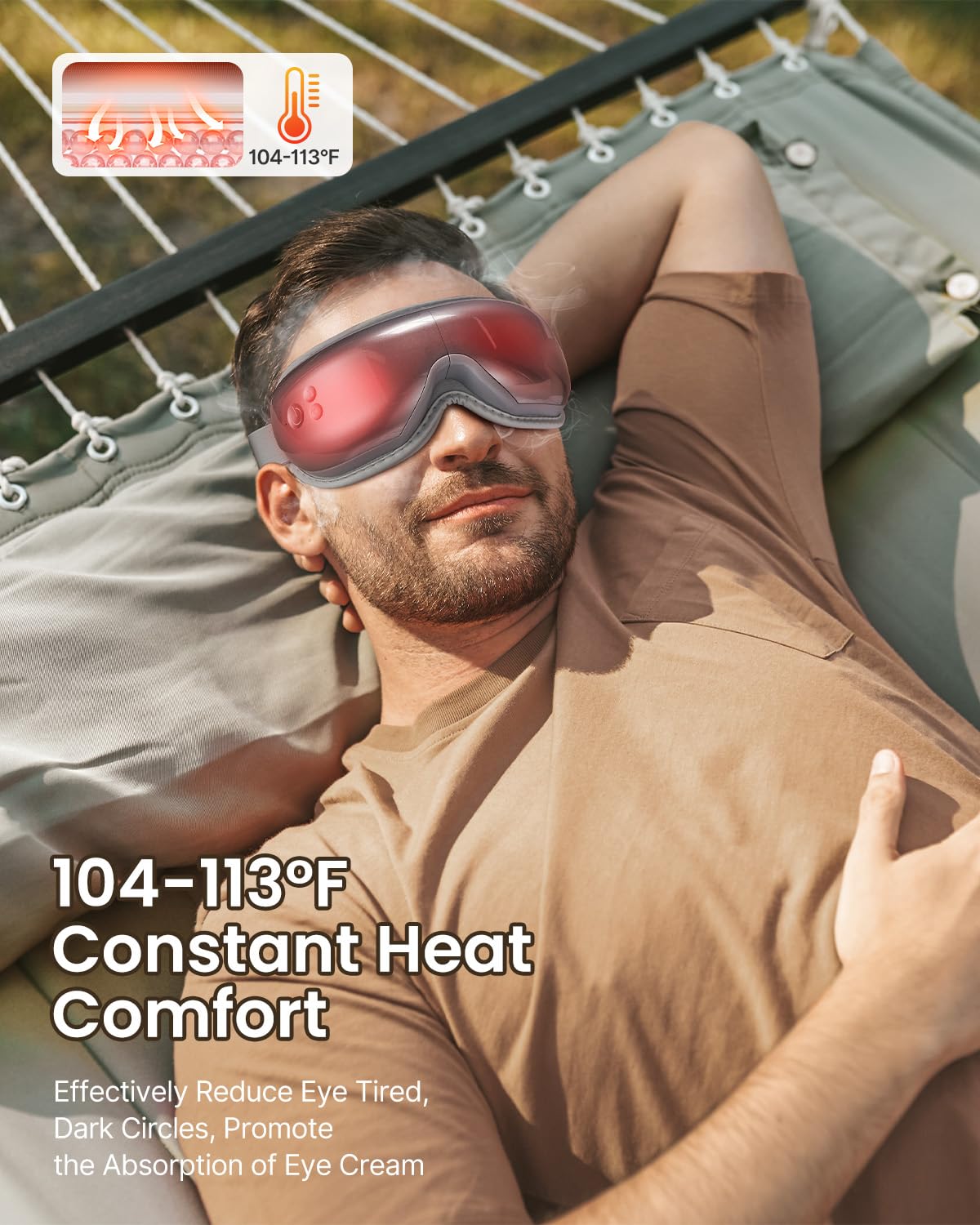 Q: What are the benefits of using the RENPHO Eye Massager?A: The RENPHO Eye Massager helps block out light and provides soothing warmth to tired eyes, reducing stress and enhancing sleep quality. It features comfortable heating pads that maintain a temperature between 104°F and 113°F, making it perfect for relaxation.