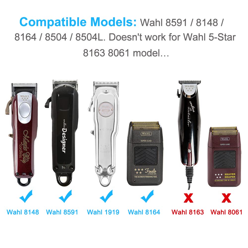 Q: Is this charger compatible with all Wahl clipper models?A: No, this charger is specifically designed for select Wahl clipper models, including the 8504-400, 1919 100 Year Clipper, 8591-018, 8164, and 8148. Please ensure your clipper model matches the listed compatibility.