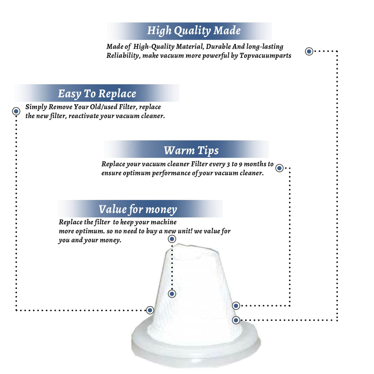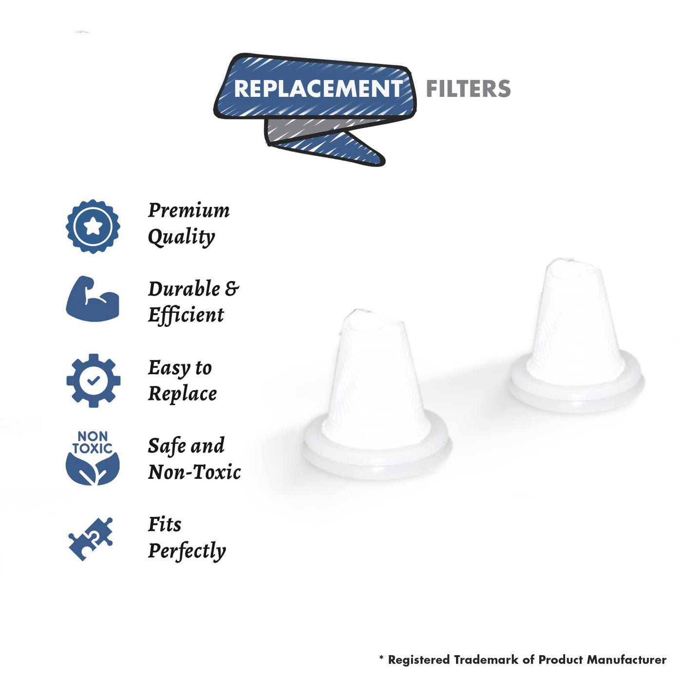 Q: What is the material of the replacement filters?A: The replacement filters are made from cloth. This high-quality material ensures durability and effective filtration for your vacuum cleaner.