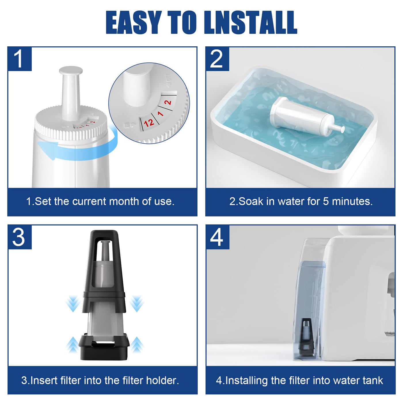 Q: How do I install the water filter in my espresso machine?A: To install the filter, immerse it in freshwater for five minutes. Then, place it into the filter holder and insert it into the water tank of your espresso machine.