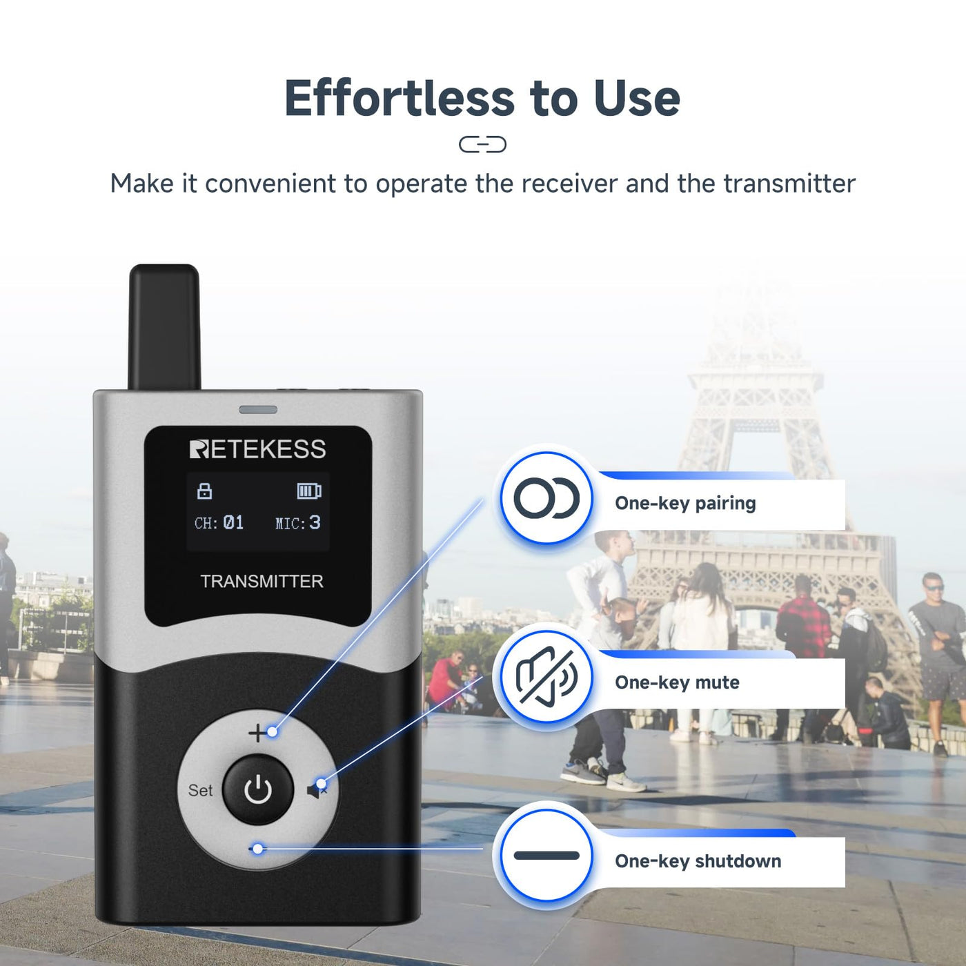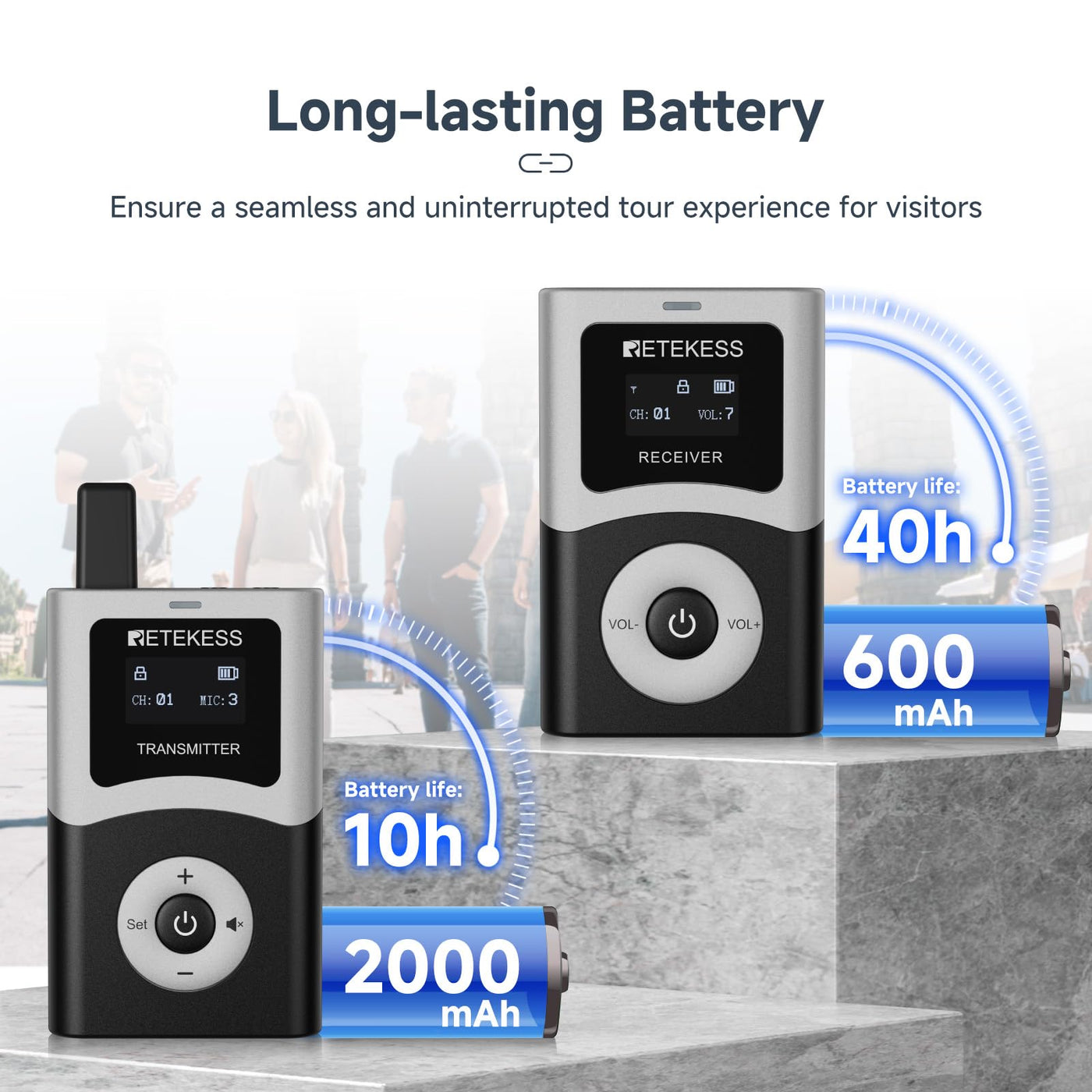 Retekess T130U Tour Guide System, Utilizing Uhf Fully Digital Low-Power Technology, The Transmitter Boasts A Working Range Of Up To 200 Meters And Supports One-Button Operation. The Transmitter Can Operate For 10 Hours, While The Receiver Can Run For 40 Hours. The Transmitter Also Supports Simultaneous Charging And Use. It Is Ideal For Use In Tourism, Visits, And Other Similar Scenarios.