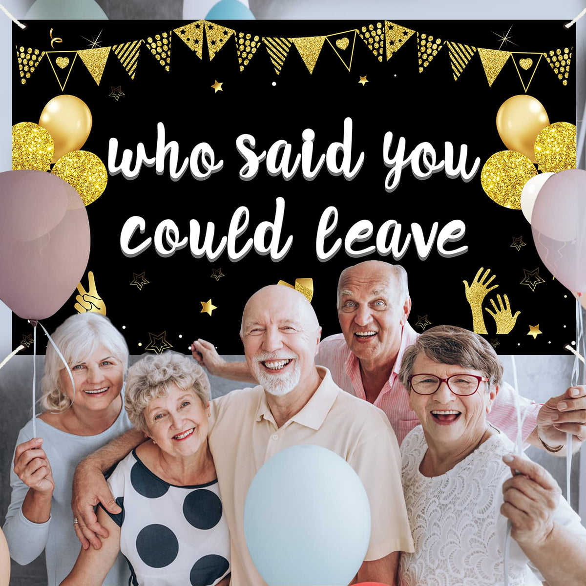 Who Said You Could Leave Banner Backdrop Farewell Party Decorations Material:Polyester Color:Black And Gold Size: 72.8 X 43.3 Inches Application: Very Suitable For Retirement Party, We Will Miss You Party, Farewell Party, Goodbye Party, Going Away Party, The Legend Has Retired Party, Resignation Party, Job Change Office Work Party Decorations,Etc.. Usage Scenarios: You Can Hang It On Offices, Living Rooms, Doors, Walls, Windows, Courtyards, Branches And Other Places For Decoration. It Is An Excellent Photo Background. Package Included: 1 X ''Who Said You Could Leave'' Banner Backdrop; 1 X Ribbon.