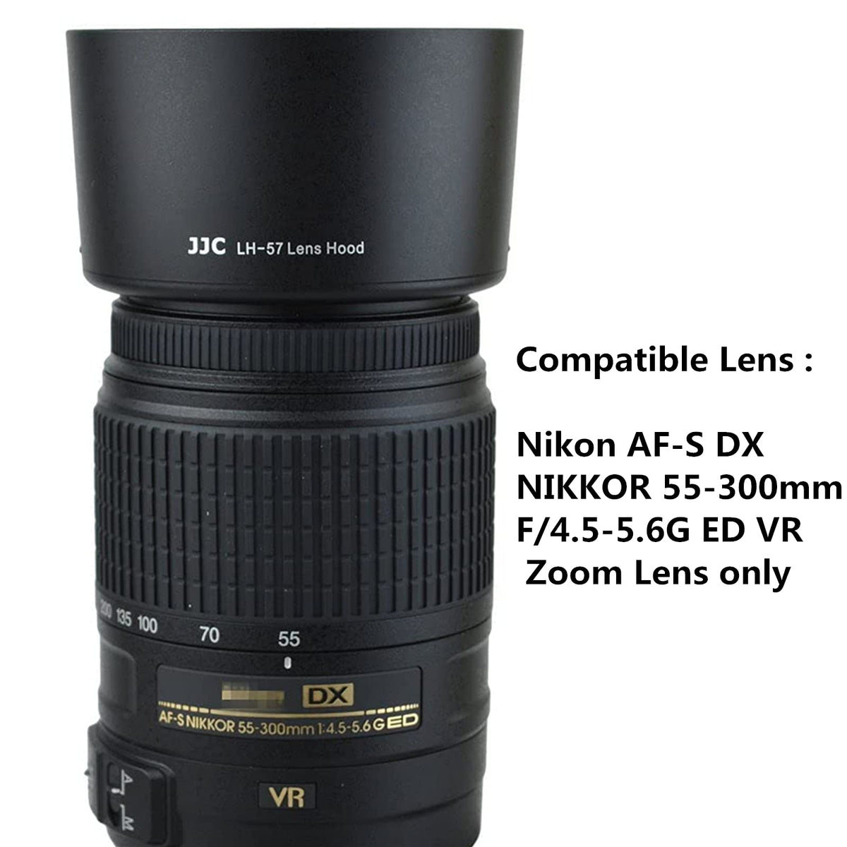 Q: What lenses are compatible with the JJC LH-57 lens hood?A: The JJC LH-57 lens hood is specifically designed to be compatible with the Nikon AF-S DX NIKKOR 55-300mm f/4.5-5.6G ED VR Zoom Lens. It is not suitable for other lenses.
