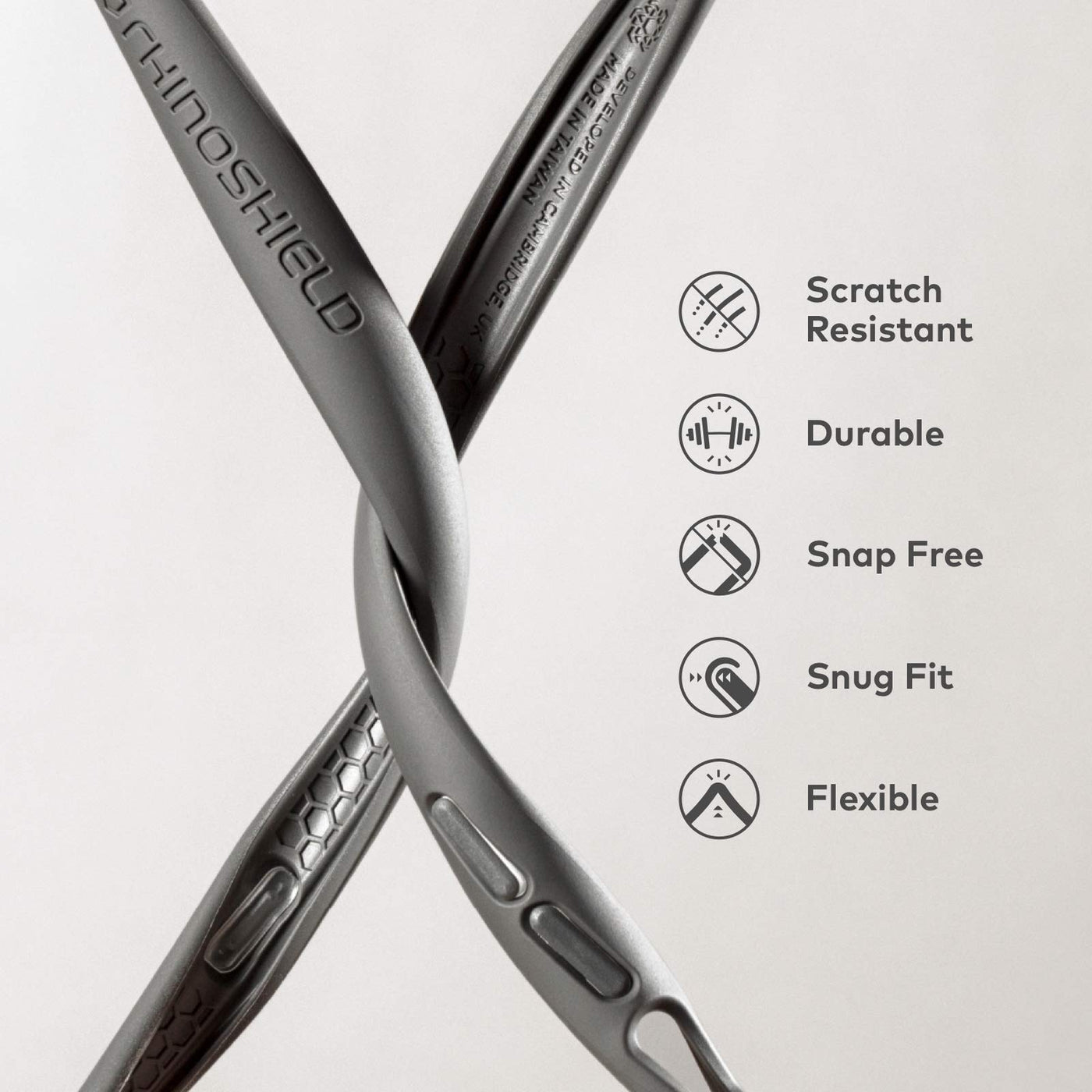Q: What materials are used in the RhinoShield Bumper Case?A: The RhinoShield Bumper Case is made from thermoplastic elastomer, which is tough yet flexible. It is scratch-resistant, 100% recyclable, and BPA-free, ensuring safety for you and your family.