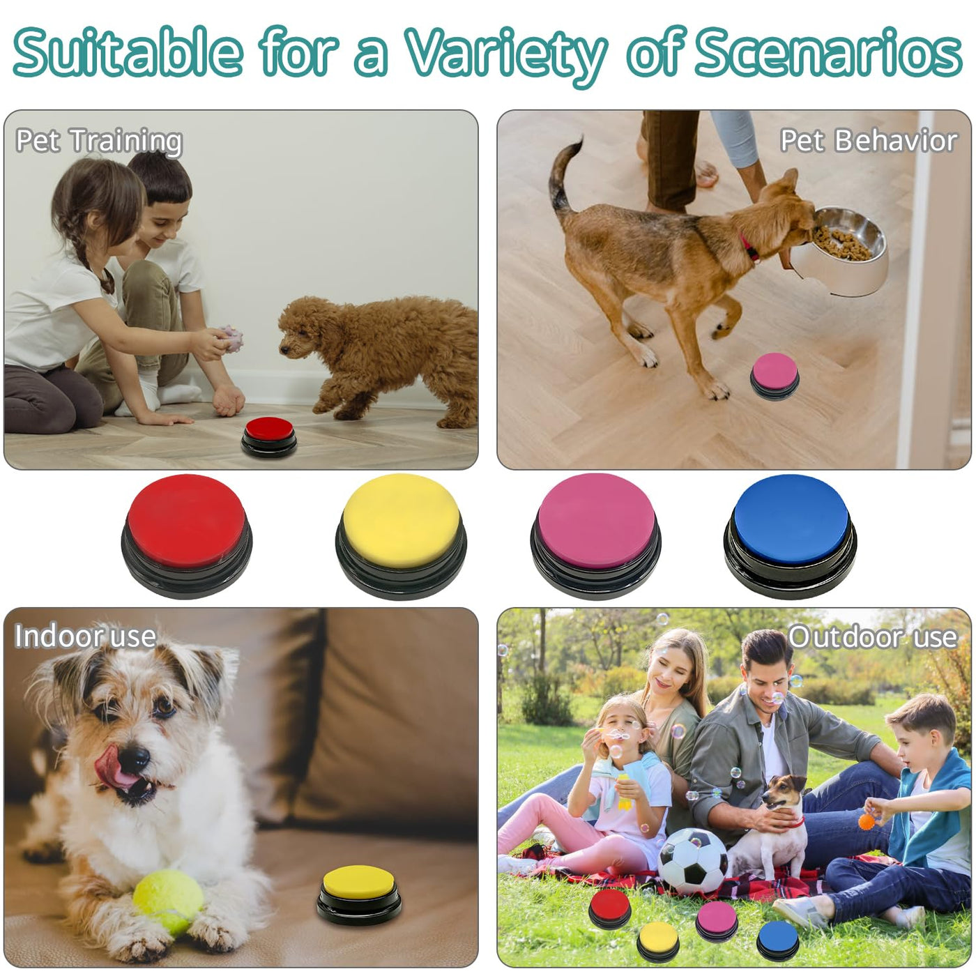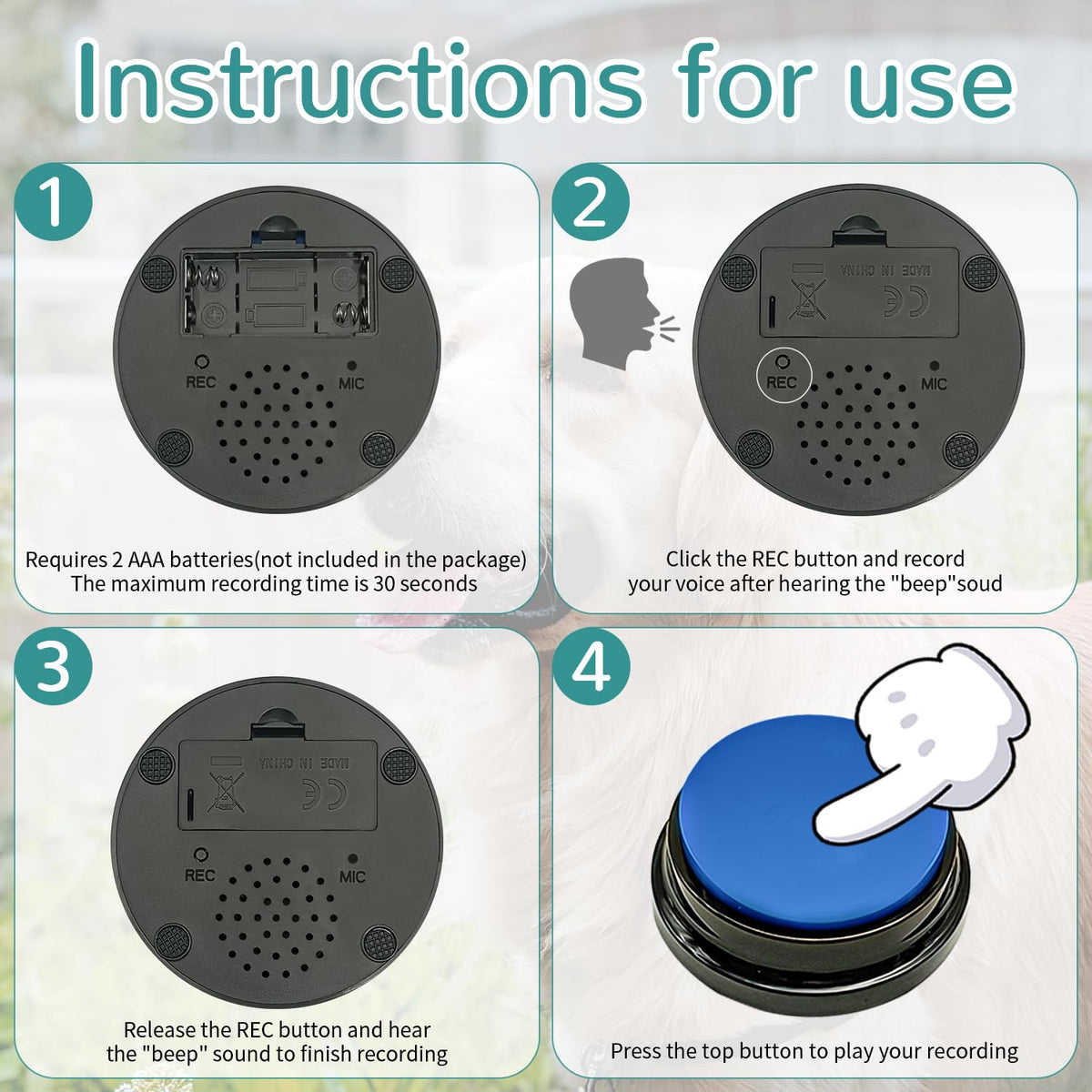 ?? ? Simple To Use?- The Switch On Bottom To Control Its Working, You Can Change The Message At Any Time You Want. | ???Interactivity?- By Recording Simple Words Or Sentences Like ''Play'', ''Water'', ''Food'', ''Outside '' To Let Your Pets Say What They Want And Need . Or Have Answer Game With Family Or Friend. It Will Add Much Fun In Life. | ???30 Second Clear Recording?The Record Button Allows You To Record Up To 30 Seconds Of Clear Sound. The Sound Is Clear And Loud. Its Portable Size Perfect For Families To Get Together And Play Games Anywhere. | ???Meaningful Gifts?- The Product Offers A Lot Of Unexpected Entertainment And Interaction. Example Family Games, Pranks Between Friends, Training With Pets, Communication For Non-Verbal Autistic Person Etc. | ???Package Include?- 4 Recordable Buttons, 1 Rubber Mat, 25 Stickers, 36 Pairs Adhesive Dots.