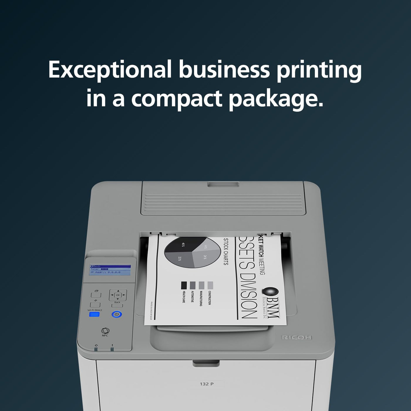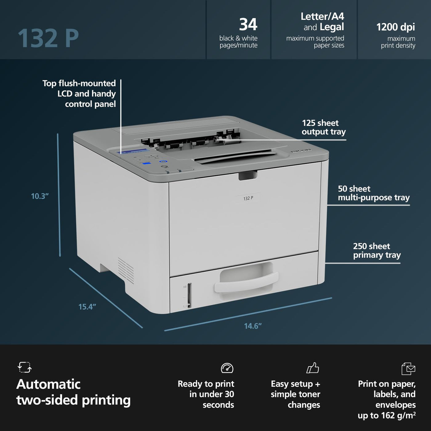 The RICOH 132 P duplex printer fits in nearly any space, can be accessed via the network by any user, and has fast first print speeds to deliver timely prints in monochrome.