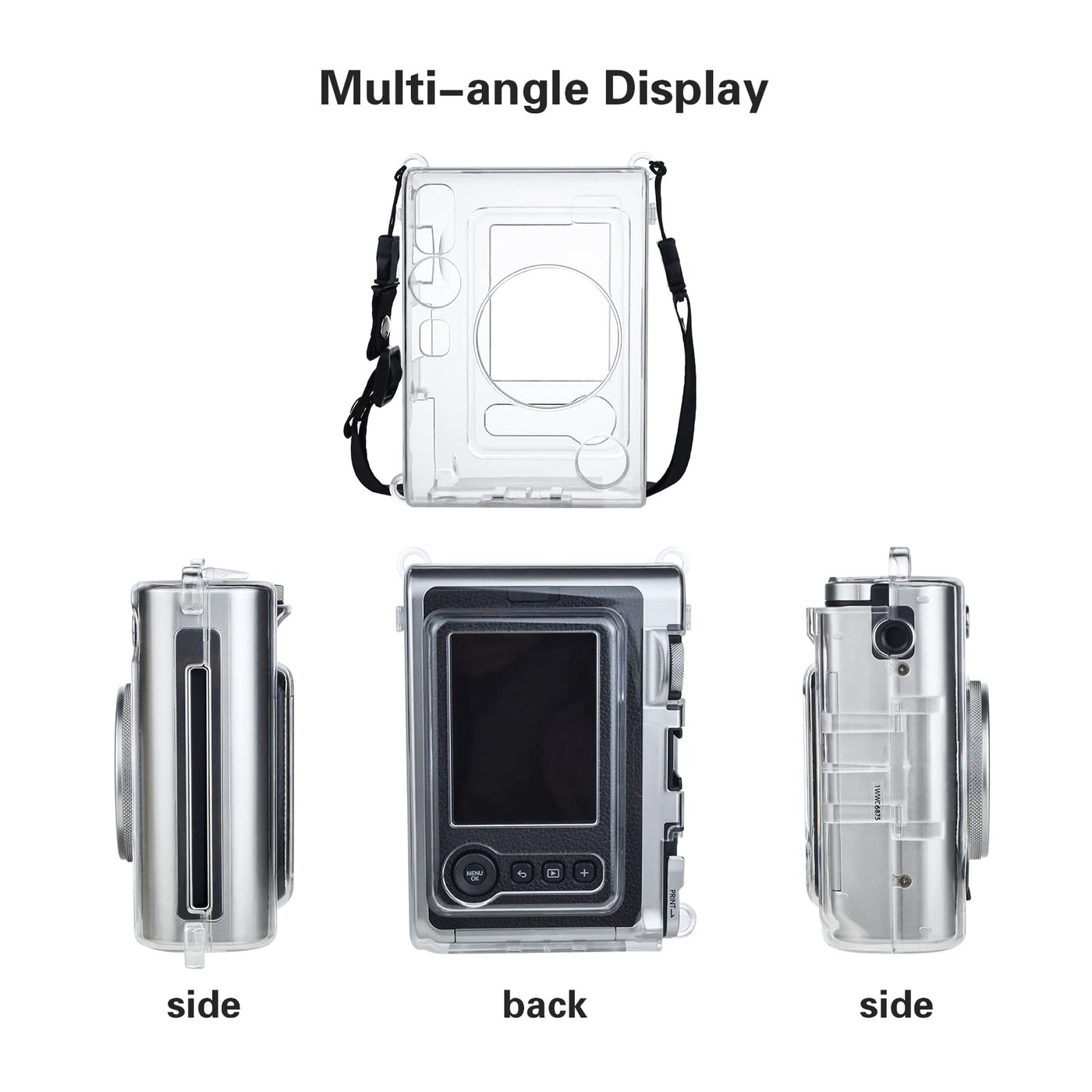 Q: How does the clear case protect the Instax Mini Evo camera?A: The clear case is made from high-quality crystal PC material, providing all-round protection against dust, scratches, and impacts while allowing easy access to the camera's features.