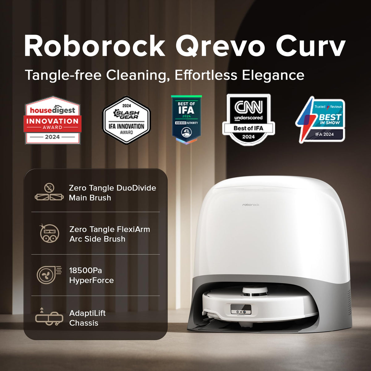 Q: What makes the Roborock Qrevo Curv ideal for pet owners?A: The Roborock Qrevo Curv features Zero-Tangling Brushes and a powerful 18,500 Pa suction, making it highly effective at capturing pet hair and dander. Additionally, its FlexiArm Technology ensures thorough cleaning along edges and corners, perfect for homes with pets.