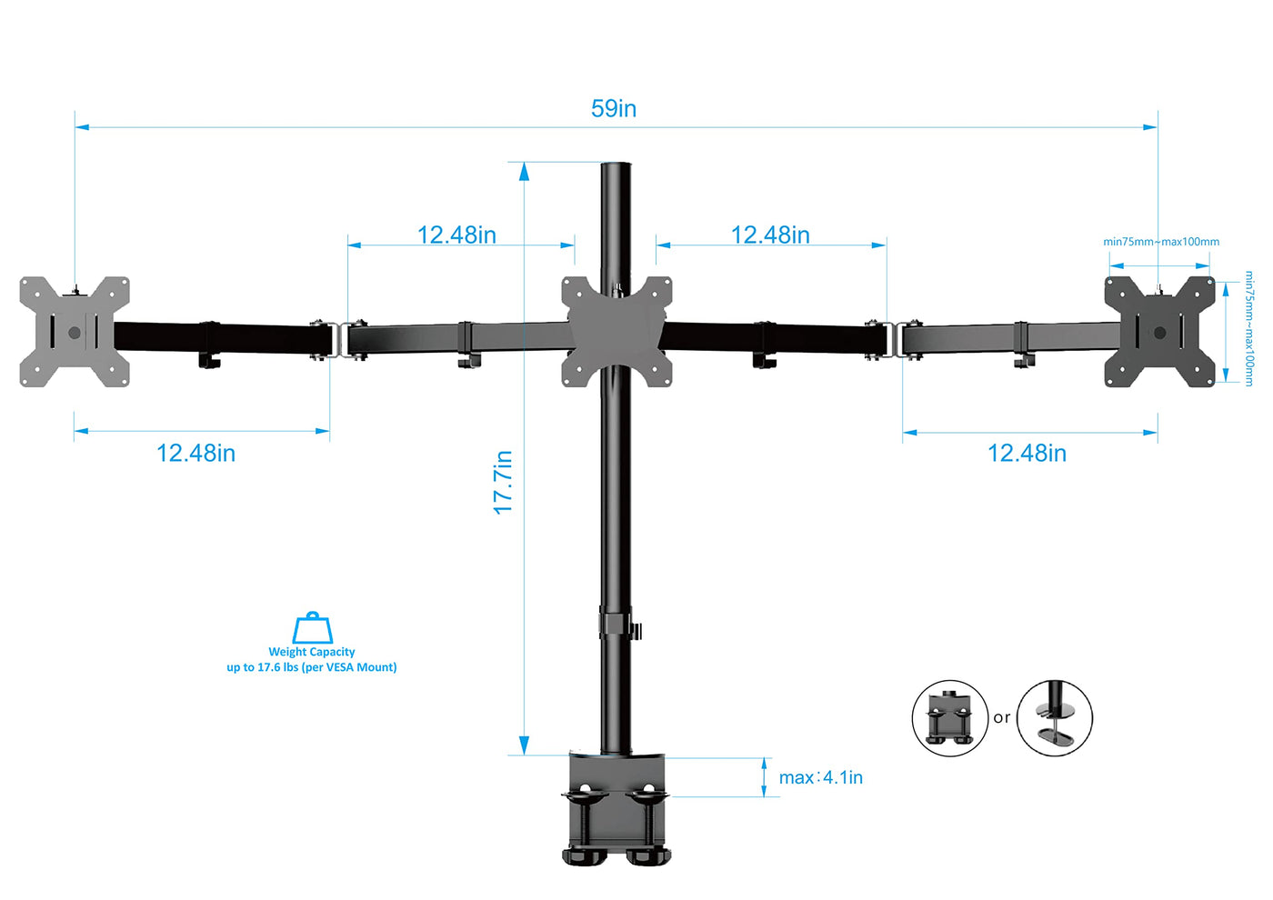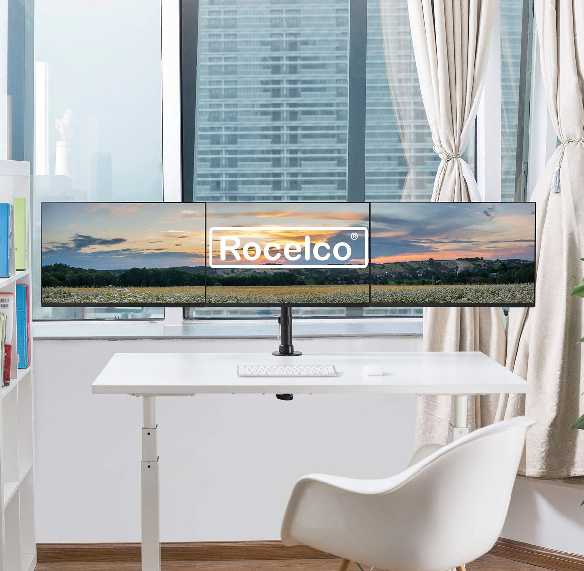 Tired of a cluttered desk, free up desk space with the DM3 monitor mount. Securely attach your three screens, up to 27'/17. 6 lbs. Each with standard 75x75mm or 100x100mm mounting pattern, to any desk or surface up to 3. 5' Thick. Also mounts to larger adjustable Desk Riser models including Rocelco dadr-46. Tilts + or - 45 degrees, swivels 180 degrees, rotates 360 degrees. Monitor mounts in landscape (Horizontal) or portrait (Vertical) position. Adjustable height along pole for ideal ergonomic position. Cable management clips included. Easy height adjustment up to 17. 75' And extension from pole to monitor up to 26'. Triple articulated arms allow you to position the screen for your perfect viewing angle. Reduce neck strain and improved posture with a comfortable ergonomic working position.