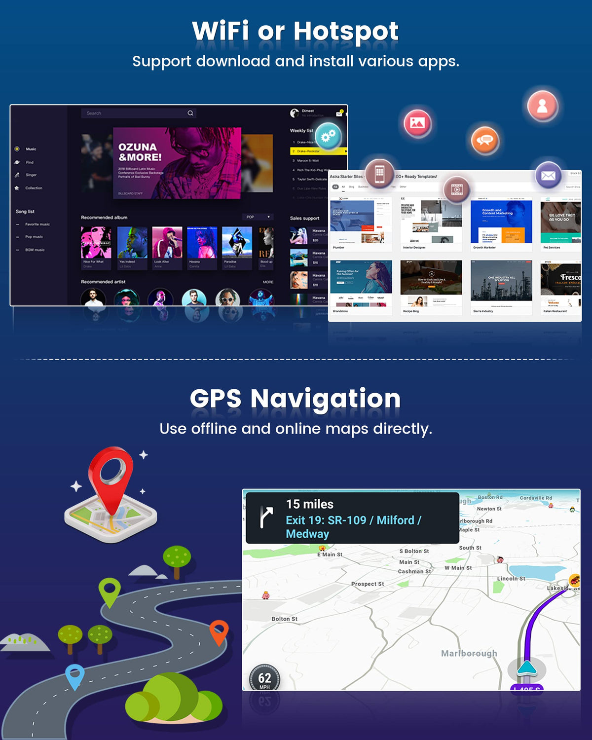 • Q: What features does the built-in GPS navigation offer? A: The built-in GPS navigation includes offline maps, supports popular navigation software like Waze, and allows for internet connectivity via WiFi to access real-time traffic updates and other apps.