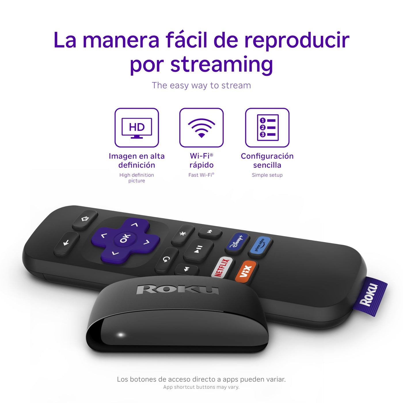 Roku Express Es La Forma M? F?Il De Comenzar A Reproducir Contenido Por Streaming Y Mejorar Tu Tv Con El Entretenimiento Que Amas. Con Una Configuraci? Guiada R?Ida Y Todo Lo Que Necesitas Incluido En La Caja, Roku Express Es El Dispositivo De Streaming Ideal Para Usuarios Nuevos, Pero Lo Suficientemente Poderoso Para Expertos En Streaming. El Control Remoto Roku Est?Dar Incluido No Tiene Controles Para La Tv. Cada Reproductor Roku Necesitaruna Red Wi-Fi Dom?Tica Confiable Para Transmitir Programas Y Contenido.Roku Express Is The Easiest Way To Start Streaming Or Upgrade Additional Tvs With The Entertainment You Love. With A Quick Guided Setup And Everything You Need Included In The Box, It? The Perfect Streaming Device For New Users But Powerful Enough For Seasoned Pros. The Included Roku Standard Remote Does Not Have Tv Controls. Every Roku Player Will Need A Reliable Home Wi-Fi Network In Order To Stream Shows And Content.