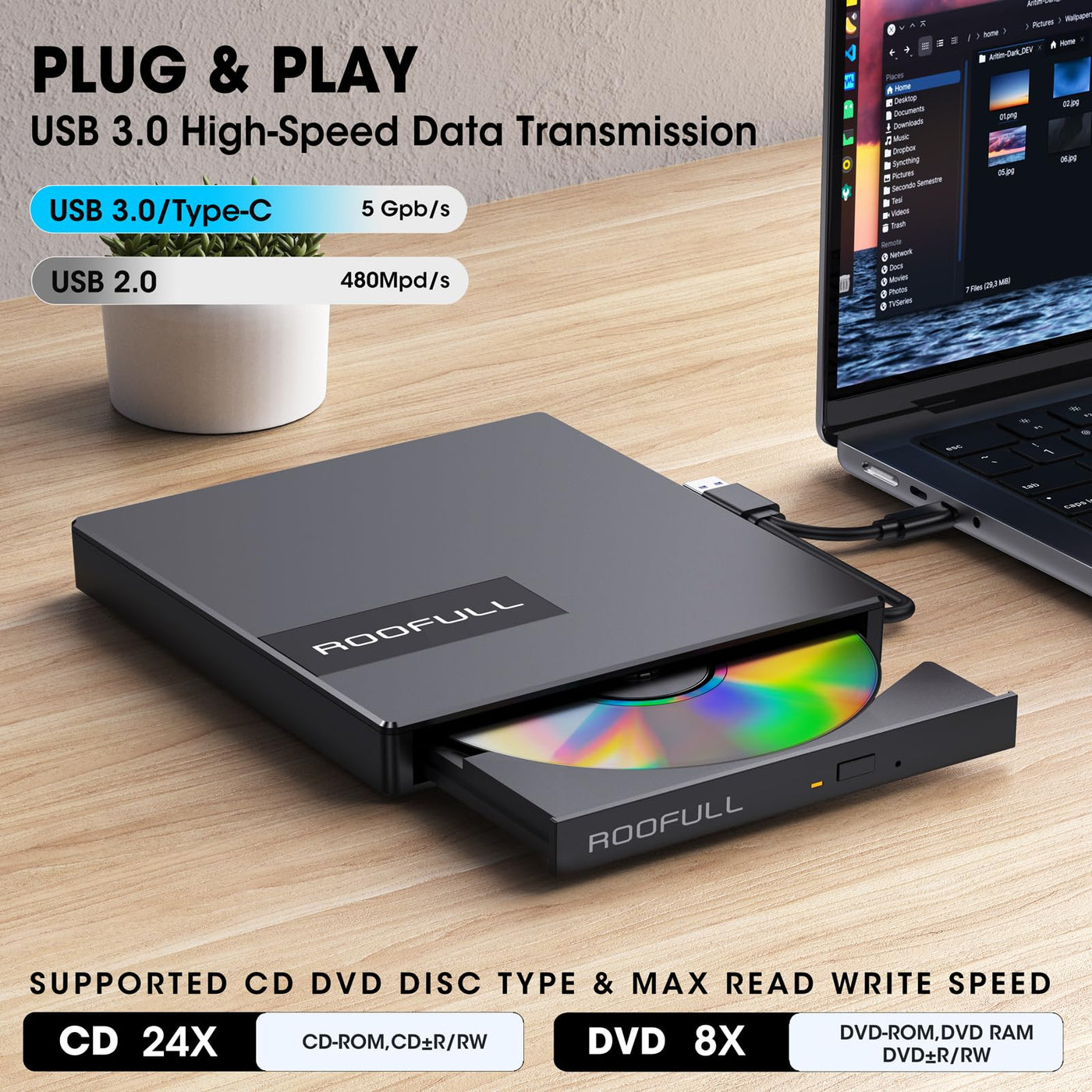 Roofull External Cd Drive For Laptop - Your Ultimate Optical Disc Companion Are You Tired Of Dealing With The Limitations Of Your Laptop Or Mac'S Internal Cd And Dvd Disc Drive? Say Hello To The Roofull Dvd Drive Usb External - The Ultimate Solution For All Your Optical Disc Needs. Whether You'Re Burning Cds, Watching Dvds, Or Accessing Data From Discs, This Cd Dvd External Drive For Laptop Offers Unparalleled Convenience And Versatility. Versatile Applications Picture This: You'Re A Student Working On A Presentation For Class, And You Need To Access Data From A Cd Your Professor Provided. With The Roofull Cd Rom External Drive For Laptop, You Can Easily Connect The Drive To Your Laptop Or Mac And Access The Necessary Files In Seconds. No Need To Hunt Down A Computer With A Built-In Disc Drive - Simply Plug In The External Drive And You'Re Good To Go. Or Perhaps You'Re A Music Enthusiast Who Still Enjoys Creating Mix Cds For Road Trips Or Sharing Tunes With Friends. With The Cd Drive External Usb, You Can Effortlessly Burn Your Favorite Songs Onto Cds, Creating Custom Playlists For Any Occasion. Whether You'Re Hosting A Party Or Hitting The Open Road, Your Personalized Music Collection Is Always Within Reach. Seamless Entertainment Movie Nights Are A Breeze With The Cd Rom External Drive For Pc. Simply Connect The Usb Dvd Drive External To Your Laptop Or Mac, Pop In Your Favorite Dvd, And Enjoy Crisp, Clear Playback On Your Computer'S Screen. Whether You'Re Catching Up On The Latest Blockbuster Or Revisiting A Classic Favorite, The Usb Cd Drive Ensures A Cinematic Experience From The Comfort Of Your Own Home. And Let'S Not Forget About Travel. Whether You'Re On A Long Flight Or Stuck In A Hotel Room, The Roofull External Dvd Drive For Laptop Is The Perfect Companion For Portable Entertainment. Pack A Selection Of Your Favorite Dvds, And You'Ll Have Hours Of Entertainment At Your Fingertips Wherever You Go. Plus, Its Compact Size Makes It Easy To Slip Into Your Carry-On Bag Or Backpack, Ensuring You'Re Always Prepared For Downtime On The Road. Convenient Compatibility With Its Plug-And-Play Functionality, The Cd Player For Laptop Is Incredibly Easy To Use. Simply Connect The Drive To Your Laptop Or Mac Via Usb, And You'Re Ready To Start Burning Cds, Watching Dvds, Or Accessing Data From Discs. No Need For Complicated Installation Or Additional Power Cords - Just Plug In And Play. Upgrade Your Laptop Or Mac With The Roofull Portable Dvd Player For Laptop And Experience The Convenience Of External Optical Drives. Say Goodbye To Compatibility Issues And Hello To Seamless Functionality With Roofull.