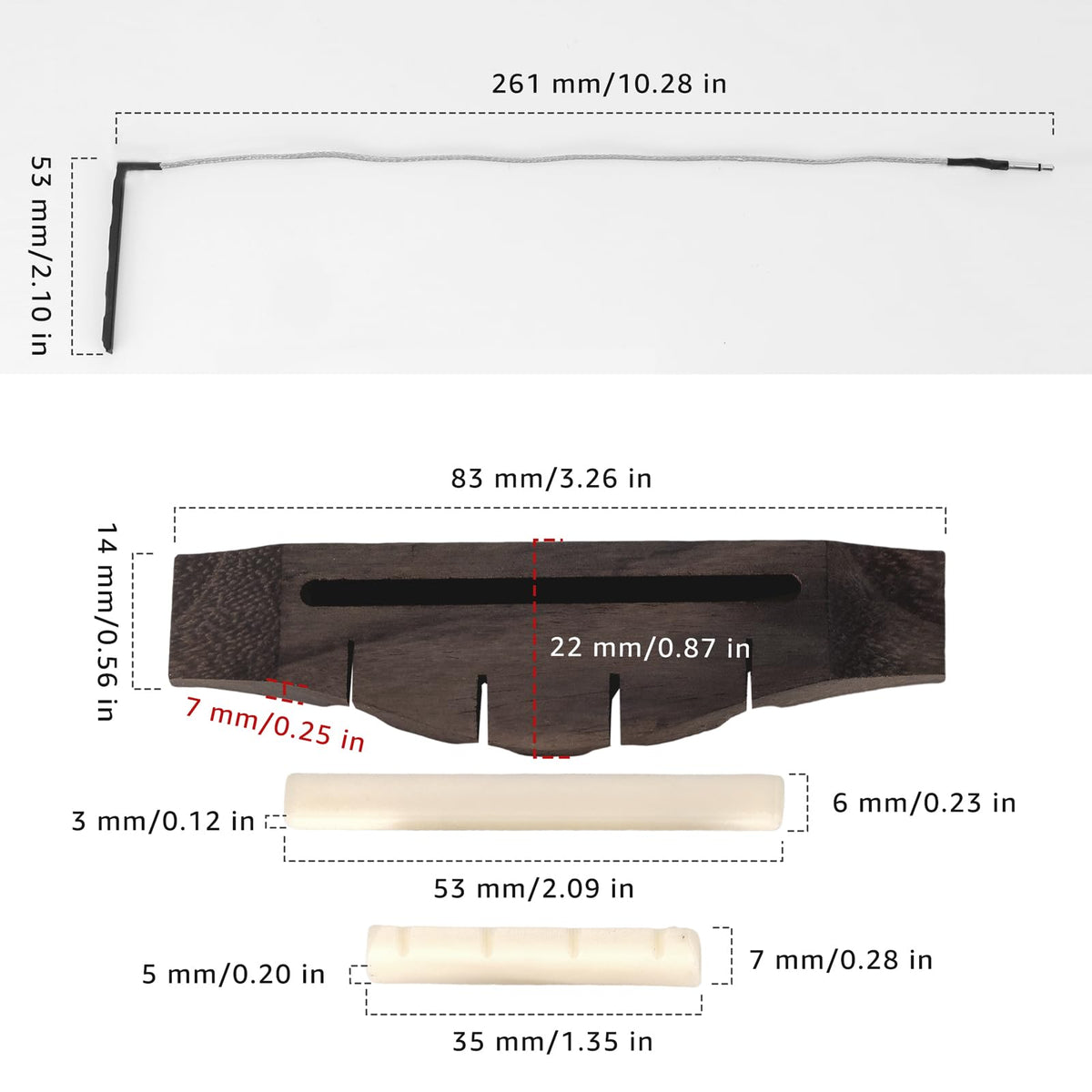 Specification: 100% Brand New, Never Used A Great Replacement For Your Old, Dirty And Dingy Ukulele Bridge, Piezo Bridge, Saddle And Nut. Easy To Install,Fit For Ukulele/4 String Guitar Bridge Size(L X H): 83Mm X 8.3Mm / 3.26'' X 0.32'' Inside Groove Length: 55Mm / 2.16 Pickup Bar Size(L X W): 51Mm X 2.5Mm ,With Standard Jack End Fit Most Preamps Saddle Size(L X W): Approx. 53.4 X 2.4Mm / 2.1'' X 0.09'' Nut Size: Approx. 36 X 3.9 X 6.4Mm / 1.41'' X 0.15'' X 0.25'' Material: Rosewood And Plastic Package Includes: 1 X Ukulele Bridge 1 X Piezo Bridge 1 X Saddle 1 X Nut