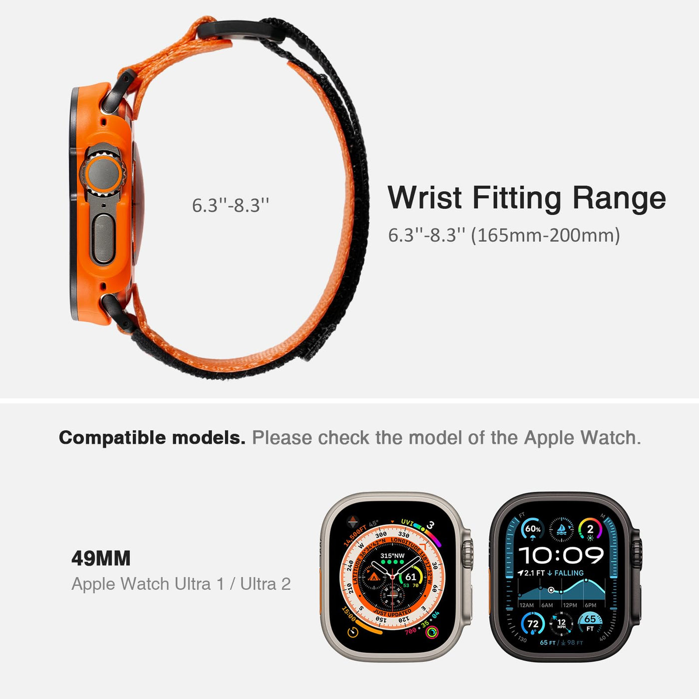 Q: What Apple Watch models are compatible with this Rugged Case and Band?A: This Rugged Case with Band is compatible with Apple Watch series 1 through 9, SE, and SE2 in sizes 38mm, 40mm, 41mm, 42mm, 44mm, 45mm, and 46mm. It is specifically designed for the Ultra 1 and 2 series at 49mm.