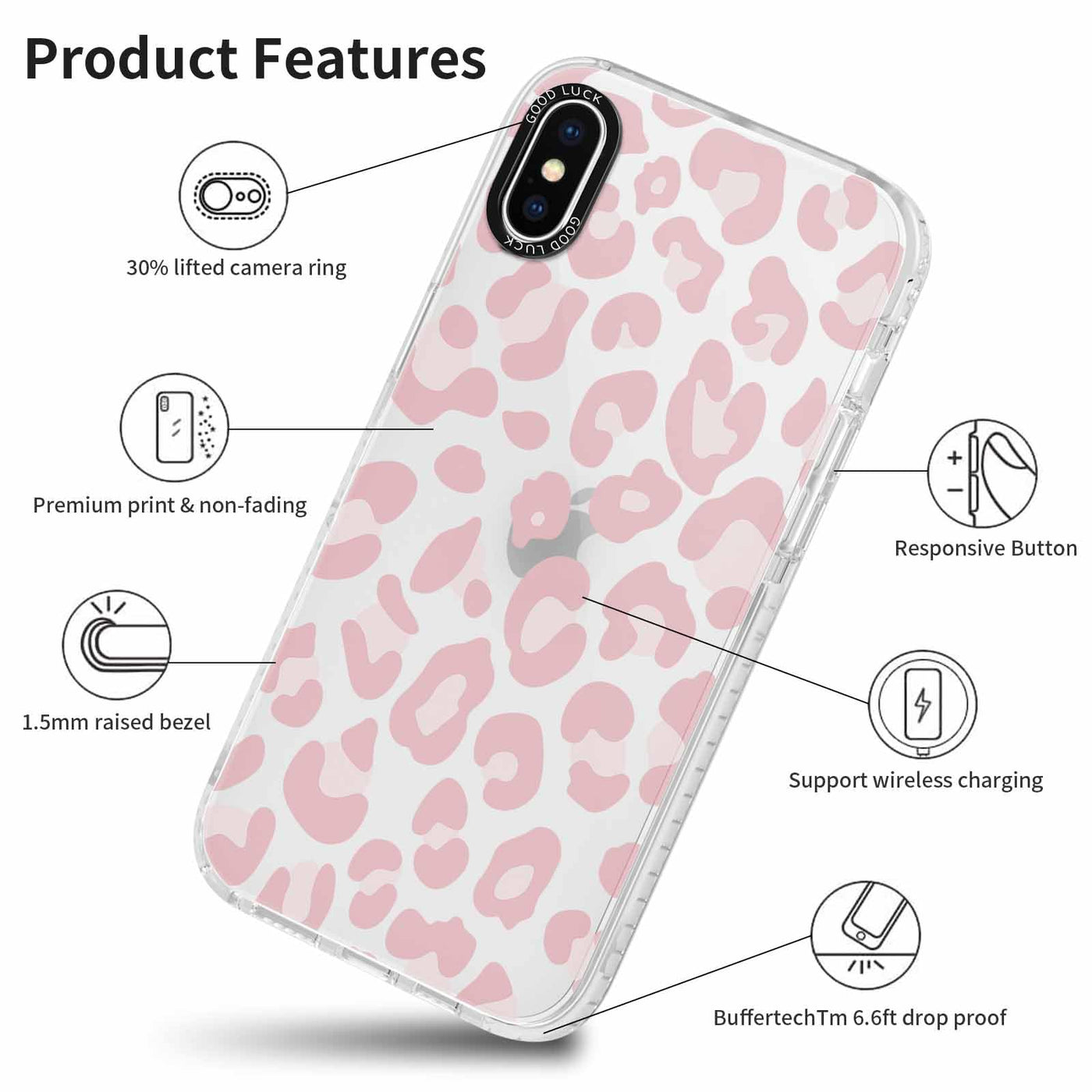 Q: Is the RUMDEY iPhone X/XS case compatible with wireless charging?A: Yes, the RUMDEY Cute Clear Leopard Case is specially designed for the iPhone X/XS and supports wireless charging, ensuring you can charge your phone without removing the case.