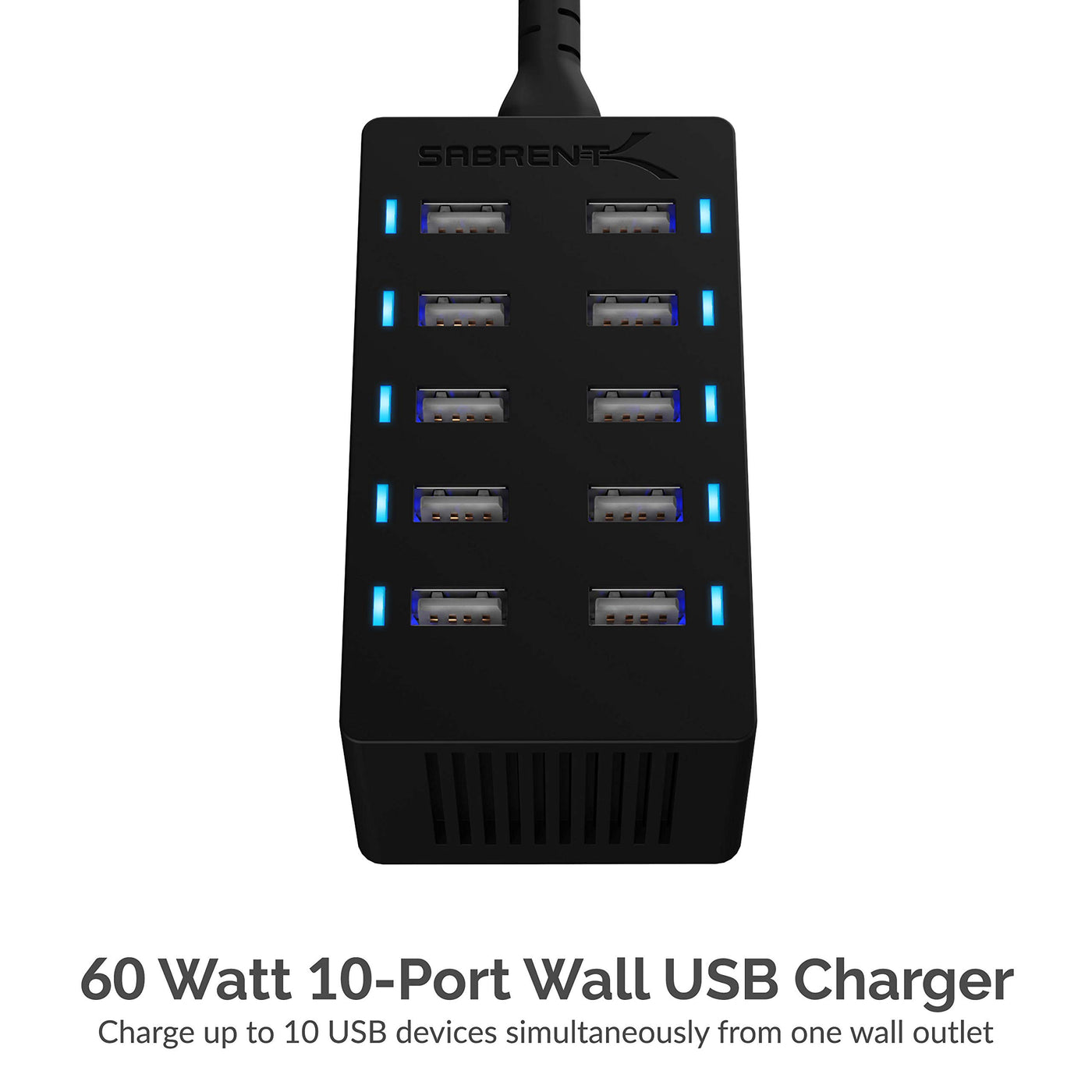Sabrent 60 Watt (12 Amp) 10-Port [Ul Certified] Family-Sized Desktop Usb Rapid Charger. Smart Usb Ports With Auto Detect Technol