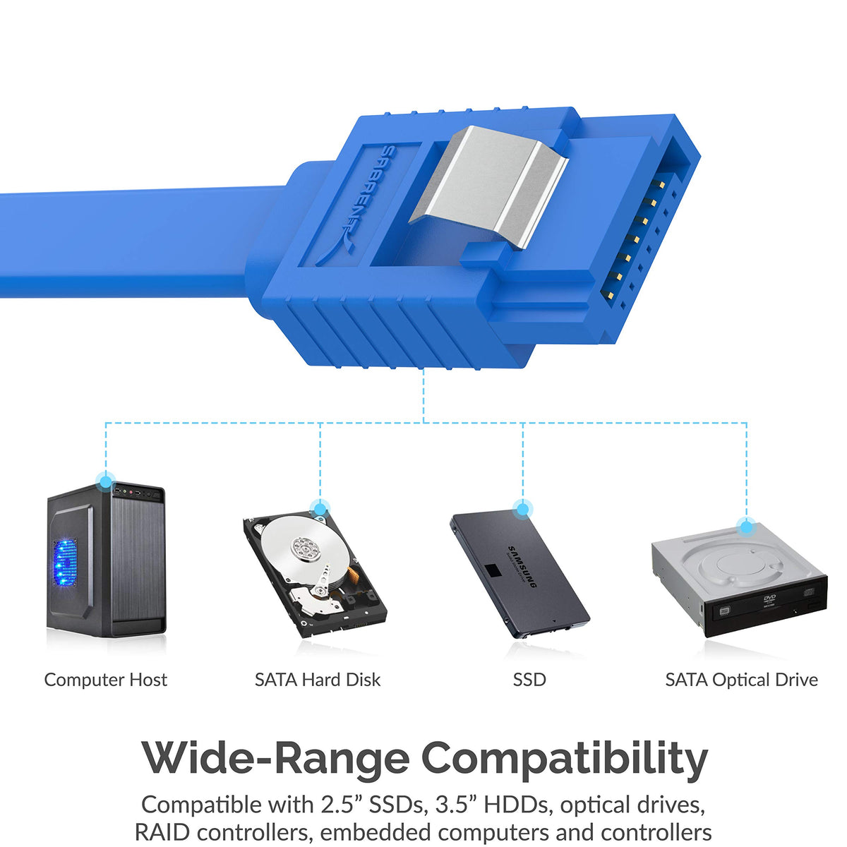 Sabrent Sata Iii (6 Gbit/S) Straight Data Cable With Locking Latch For Hdd / Ssd / Cd And Dvd Drives (3 Pack - 20-Inch) In Blue (Cb-Sfb3). Designed To Connect Motherboards And Host Controllers To Internal Serial Ata Hard Drives And Dvd Drives, Quickly Upgrading Your Computer For Expanded Storage. Please Note: This Cable Does Not Provide Power. It Is A Data Cable Only. Drive Needs To Be Powered Separately. Super Speed: Designed Using Sata Iii With Speeds Of Up To 6 Gbit/S This Cable Delivers Superior Performance And Is Perfect For A Gaming Or Raid Setups. This 3-Pack Of 20'' Cables Is Perfect For Your Next Computer Setup Or To Have Handy As Reliable Spare Part For Last Minute Setups And Troubleshooting. Backward Compatible With Sata I & Ii. Features Straight Sata Connectors With Metal Locking Latch. Designed To Connect Internal Serial Ata Hard Disks, Ssds, And Optical Drives To Motherboards And Host Controllers. Fully Compliant With The Sata Iii Specification, Allowing For Data Transfer Speeds Of Up To 6 Gbit/S (600 Mb/S). Compatible With 2.5 Ssds, 3.5 Hdds, Optical Drives, Raid Controllers, Embedded Computers And Controllers. Package Contents 3 X 20'' Sata Cables. User Manual.