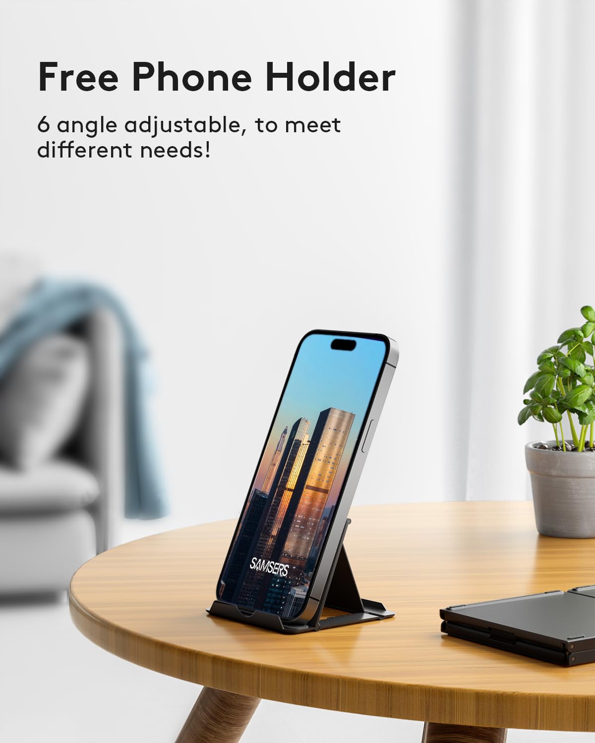 ?Samsers Dual-Mode Tri-Fold Portable Bluetooth Folding Keyboard With Sensitive Touchpad & Phone Stand Holder? Features: ?Samsers Multi-Device Bluetooth Keyboard Supports 3 Devices Connection Simultaneously, Seamless Switching Without Delay (2.4G Wireless + Bluetooth 1 + Bluetooth 2). ?Upgrade Sensitive Touchpad Supports Mouse Left And Right Key Function, So You Can Control The Device Without Using Mouse. More Convenient And Efficient! ?Updated Richer And More Practical Multimedia Shortcut Functions Make Your Work More Convenient And More Efficient! ?The Slim Design Makes It Easy To Carry Around In Your Pocket Or Backpack. Perfect Gift For Travelers And Typists! ?Phone Stand With Six Adjustable Angles To Create Your Perfect Viewing Angle. More Convenient And Efficient! ?The Oxidized Matte Exterior, Made Of Abs+Pc Material, Creates An Exceptional Touch And A Simple, Stylish Look. ?Built-In Magnetic Closure Prevents Accidental Opening During Storage Or Transportation. ?Built-In Low-Power Rechargeable Lithium Battery, Save More Power And Last Longer. Specification: Open Size: 11.89 X 3.85 X 0.41In Folded Size: 5.7 X 3.9 X 0.4 In Weight: 6.9Oz Charging Time: 2-3H Standby Time: ~560 H Uninterrupted Working Time: 48H Package: 1 X Folding Keyboard 1 X 2.4G Usb Receiver 1 X Phone Stand Holder 1 X Charging Cable 1 X User Manual