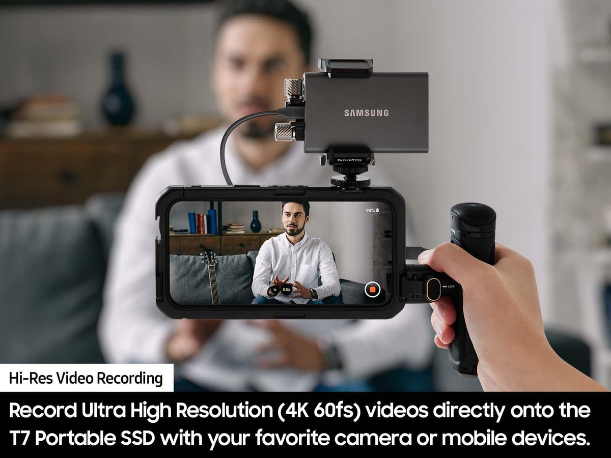 Q: Can I record videos directly onto the T7 Portable SSD?A: Yes, you can record Ultra High Resolution four K sixty frames per second videos directly onto the SSD.