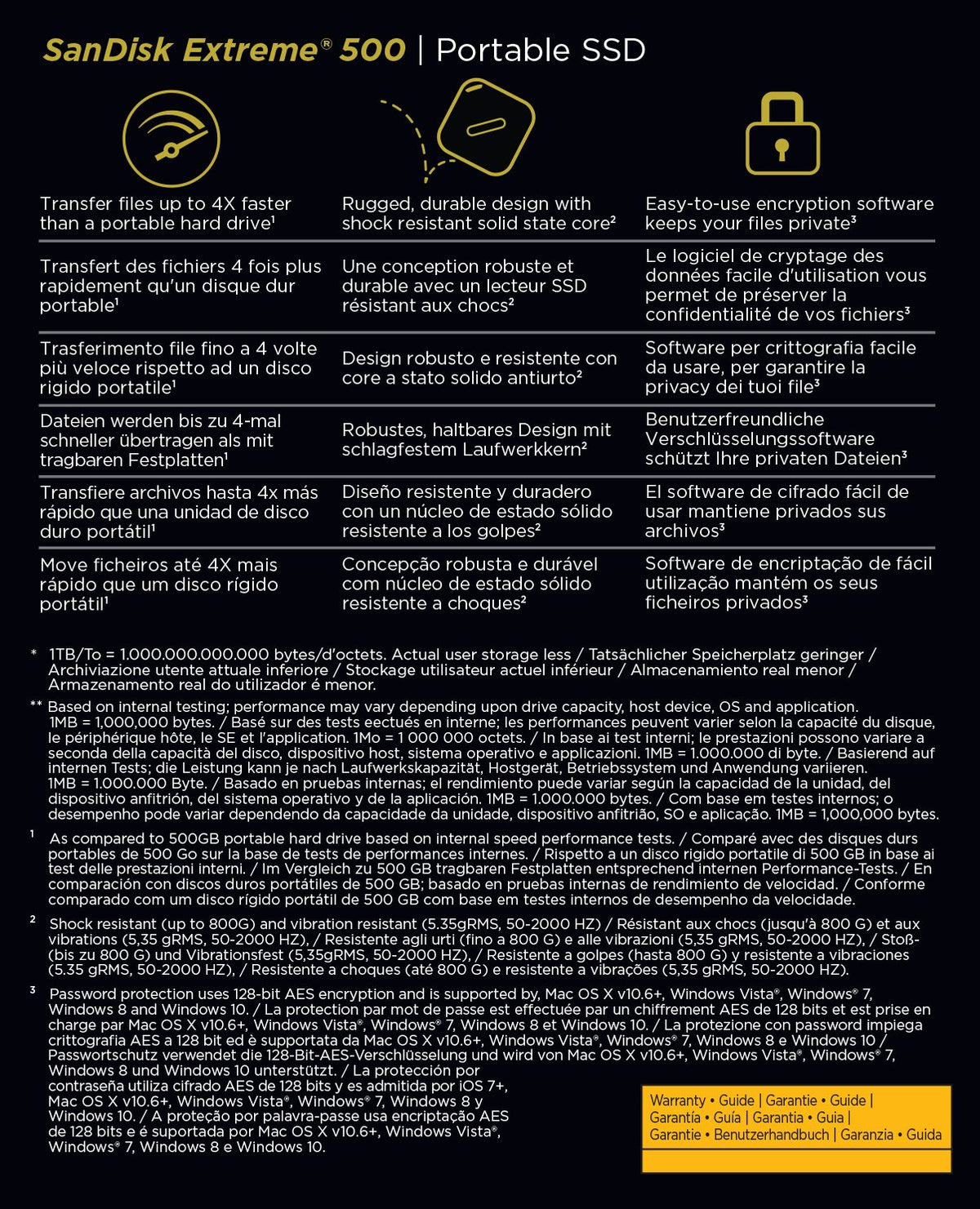 The Sandisk Extreme 500 Portable Ssd Is Less Than Half The Size Of Your Smartphone And Delivers Blazingly Fast Speeds. Get To Work In Seconds, Transfer Big Videos And Photo Libraries At Up To 415Mb/S(For 240Gb & 250Gb) [430Mb/S For 480Gb & 500Gb; 440Mb/S For 1Tb]. Designed For Durability And Style, This Drive Is Amazingly Compact And Has No Moving Parts To Break. Solid State Technology Offers Reliable, Responsive, High-Performance Storage For Photographers And Videographers Who Capture And Carry Lots Of Big Media Files. When You Care About Your Days Work, It Pays To Make The Sandisk Extreme 500 Your Portable Storage Drive.