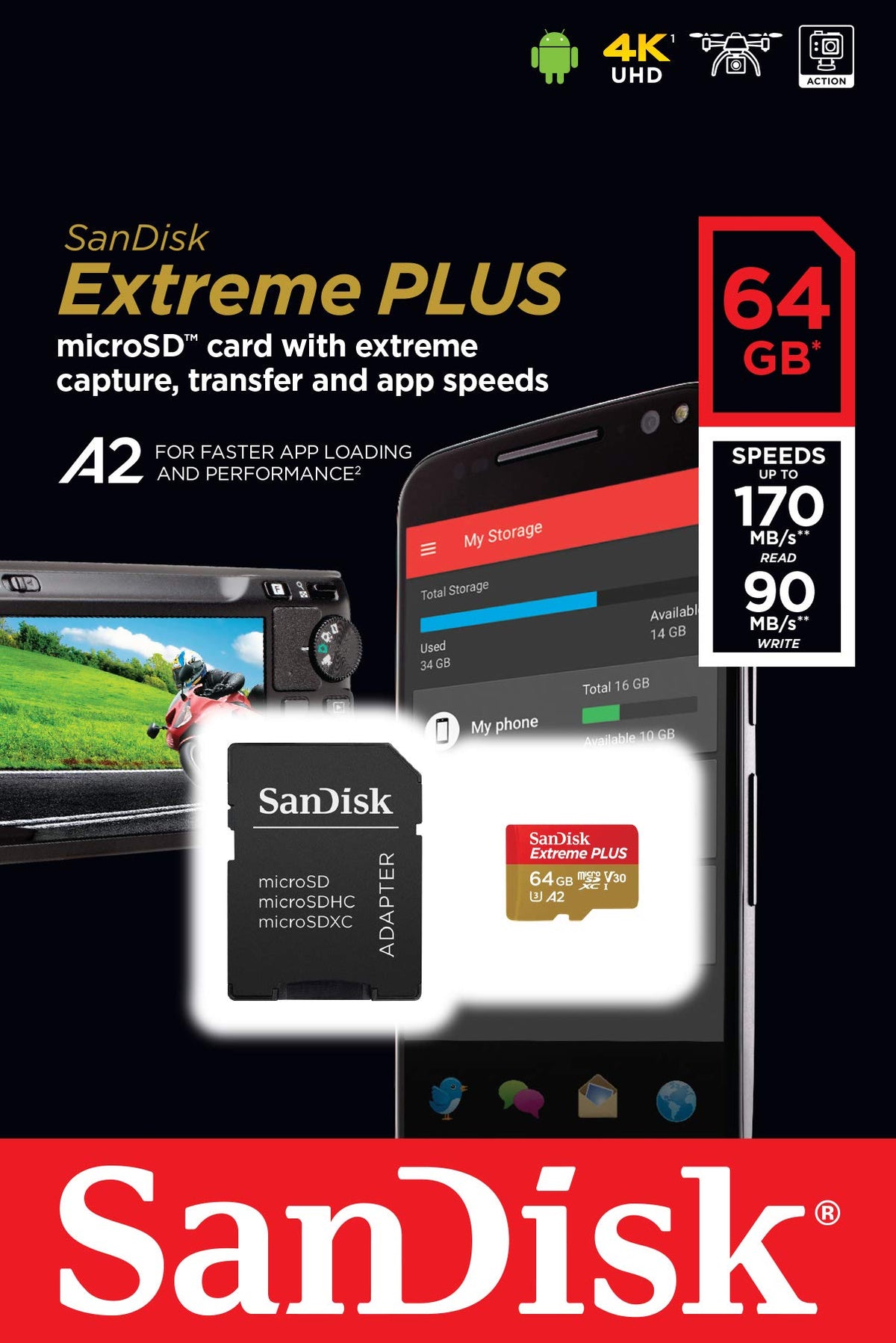Sandisk Extreme Plus 64 Gb Microsdxc Memory Card + Sd Adapter With A2 App Performance Up To 170 Mb/S, Class 10, U3, V30