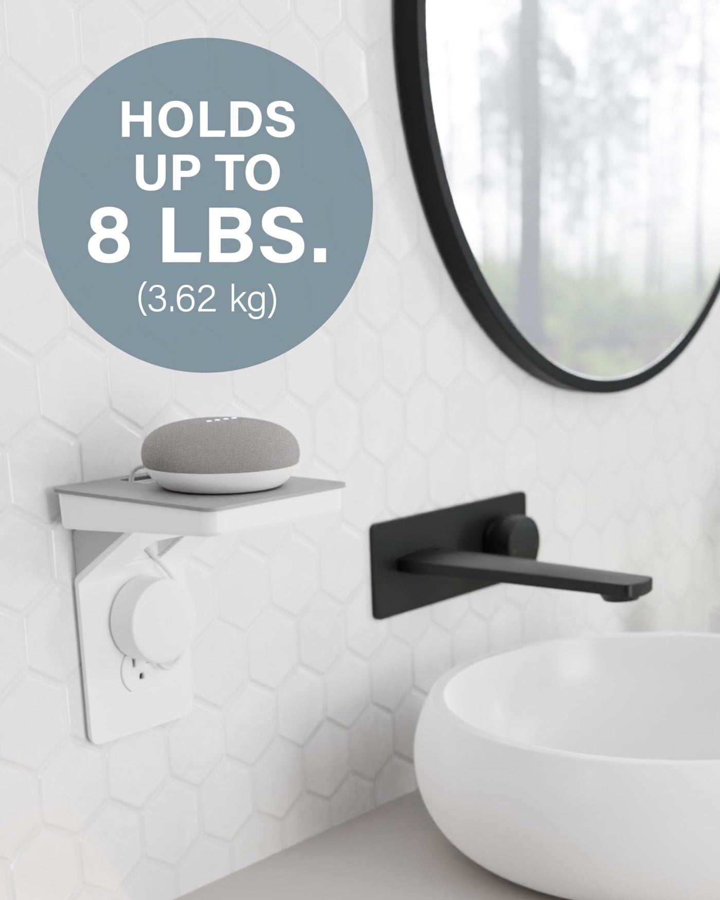 Sanus Made For Google Small Device Outlet Shelf In White & Fog Grey Holds Small Electronics Up To 8Lbs W/Built In Cord Storage