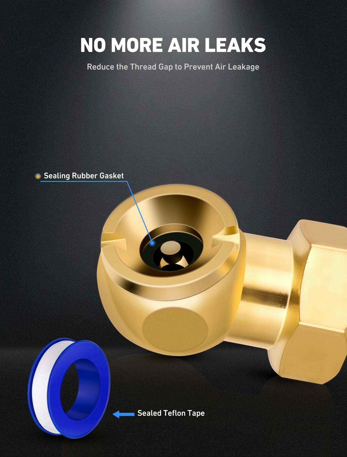 Q: How can I prevent air leaks when using the SARDVISA tire chuck?A: To minimize air leaks, ensure that the air chuck is properly connected to your hose or compressor. The closed ball structure and Teflon sealed raw tape help reduce thread gaps, preventing air from escaping during use.