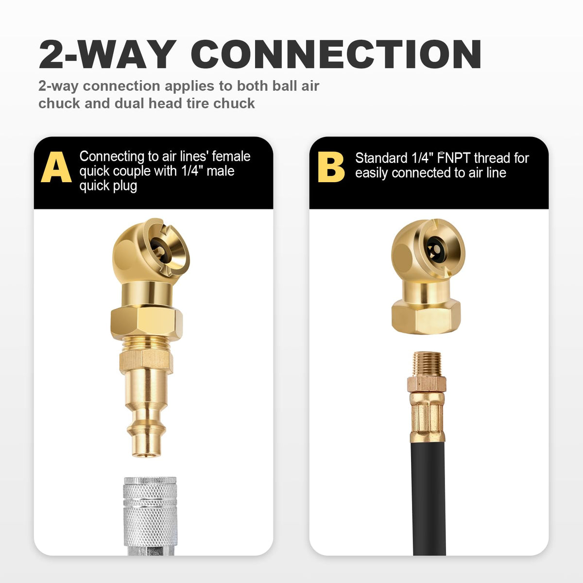 Sardvisa 2-Packs Portable Air Chucks,Matel Closed Ball Air Chuck With 1/4'' Npt Standard Quick Plug, Tire Inflator Gauge Nozzle For Air Compressor Accessories ?Closed Ball Tire Chuck?:Sardvisa Heavy Duty 2 Packs 1/4'' Fnpt Air Chucks With 2 Pcs 1/4'' Mnpt Quick Plug.300 Psi Maximum Air Pressure. Suitable For Commercial And Industrial Air Filling Applications. ?No Nore Air Leaks?: Closed Ball Structure With Waterproof Sealed Raw Tape, Reduce The Thread Gap To Prevent Air Leakage ?More Quality Material?: The Ball Inflator Nozzle And Quick Plug Are All Made Of Solid Metal Material, Which Is Resistant To Wear And Aging, And Will Not Rust Even When Used In A Humid Environment. ?Easy To Use?: When You Want To Work With A Closed Ball Pneumatic Chuck, Just Connect It By Turning The Screw.Two Ways To Connect To Meet Your Needs. ?Wide Application?: Sardvisa 2 Pcs Tire Air Chuck Set Can Be Applied For Air Pump And Compressor Accessories, And Also Can Be Applied For Trucks, Buses, Cars, Bicycles, Motorcycles And More. Great Tire Inflator Attachment Brings Convenience To Your Life.