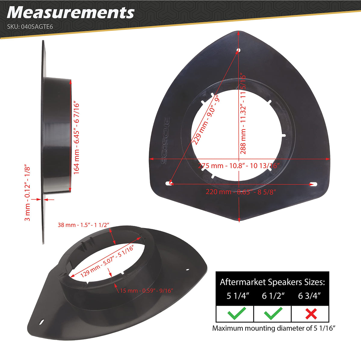The Scosche SAGTE6 speaker adapter pair is designed for upgrading your factory 6.5� speakers to most 5.25� or 6.5� aftermarket speaker with a cutout diameter of up to 5 1/16� on Select 2002 to 2008 General Motors midsized SUVs . Made from high grade ABS materials to ensure durability and longevity and engineered for a precise fit for your new speaker install. We are so confident in the quality that we back the speaker adapters up with Scosche�s Lifetime Tech Support and our Limited Lifetime warranty.