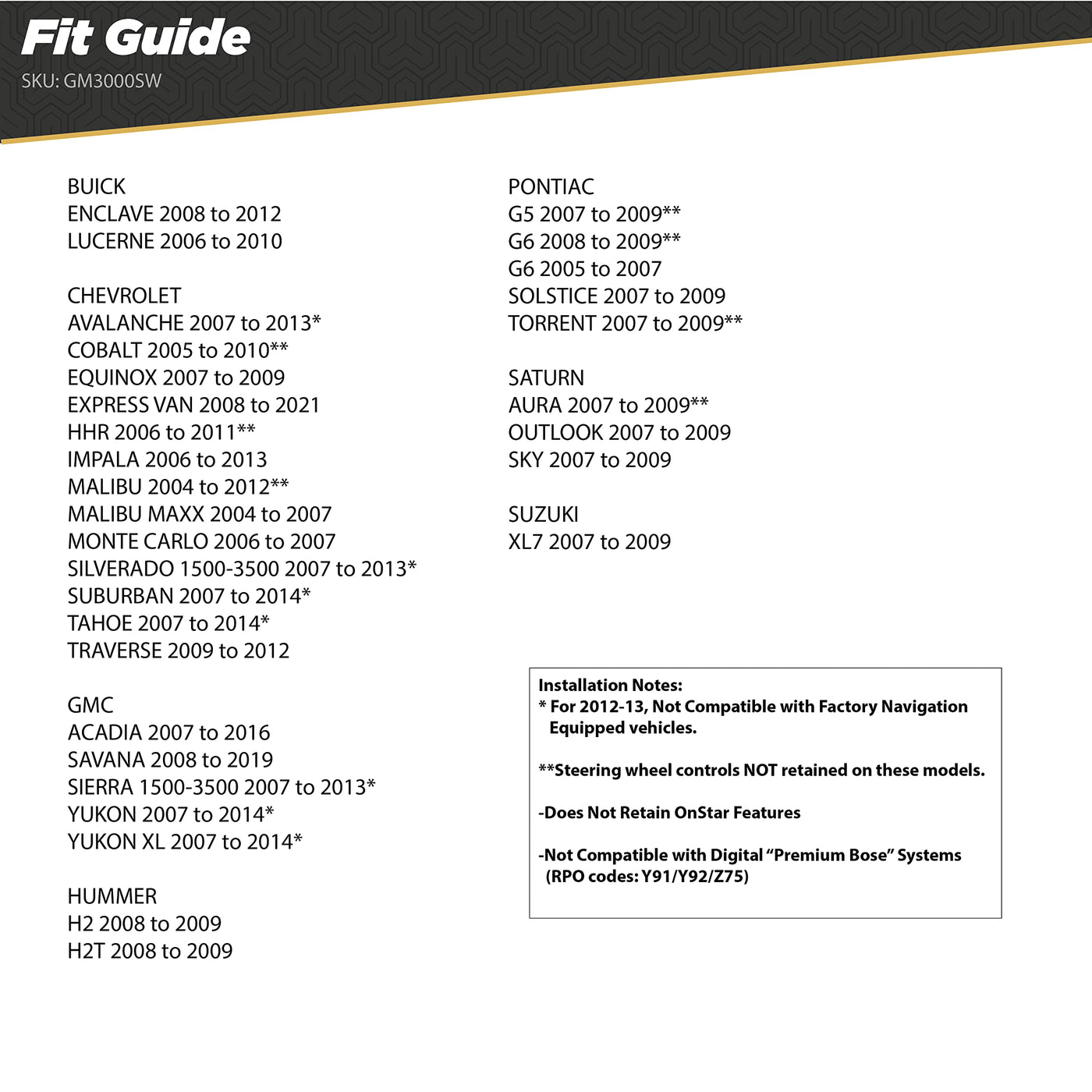 The Scosche Gm3000Sw Factory Stereo Replacement Interface Kit Is Compatible With Select 2004-Up General Motors, Including Popular Models Like Chevrolet Silverado, Gmc Yukon, And Saturn Outlook. It'S The Perfect Solution For Those Looking To Replace Their Factory Oem Stereo, Without Compromising On The Vehicle'S Original Features.This Radio Wiring Harness Is Designed To Maintain The Data-Controlled +12V Switched Acc Power For After-Market Stereo Installation. It Retains Factory-Amplified Premium Sound Systems, Ensuring You Don'T Lose Any Of Your Vehicle'S Original Sound Quality. The Scosche Gm2000Sw Also Sends The Proper Radio Healthy Messages To The Vehicle Computer, Ensuring Seamless Integration With Your Vehicle'S Existing Systems. With Standard Wire Color Codes, Installation Is A Breeze. Plus, It Allows For The Retention Of Steering Wheel Control, So You Can Continue To Use Your Vehicle'S Built-In Controls With Your New Stereo. Does Not Retain On Star Features