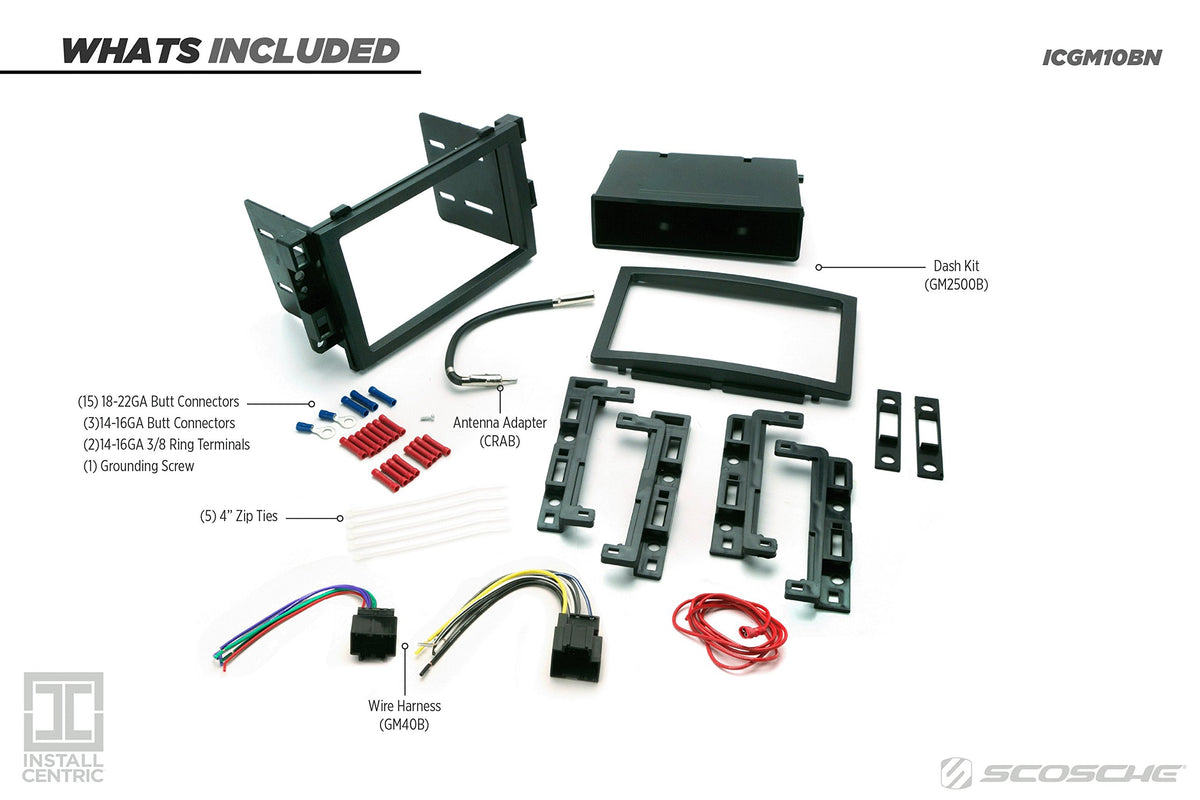 DescriptionThe Install Centric ICGM10BN complete installation solution is an ideal choice for installing an aftermarket stereo into your Select GM 2006-17 LAN vehicles without altering the dash. Everything you need to perform a basic aftermarket stereo installation is included: the dash kit, wire harness, antenna adaptor and wire connectors. The single DIN dash kit includes a kit panel, a trim ring and brackets and is manufactured from high-grade ABS with precision tolerances so it delivers a gapless fit between the dash and the kit. The wire harness allows you to connect to the factory harness without cutting any wires. The ICGM10BN kit includes step by step instructions and colored coded wires for an easier installation.