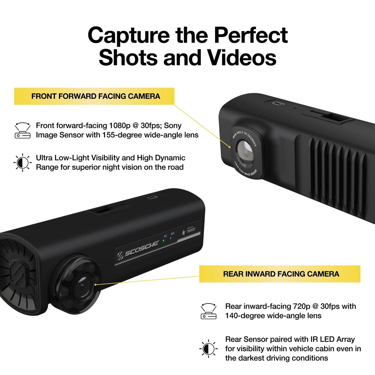 Complete Coverage - The Scosche NEXC2 Nexar-Powered dash cam ensures full security for your vehicle with high-quality front and rear cameras, capturing everything in 1080P Full HD from the 155-Degree front camera and 720P from the 140-Degree rear camera. | Seamless Integration - With the Nexar dash cam app, your footage is automatically recorded and saved to your phone, providing wireless convenience and ease of access. Enjoy FREE Nexar cloud storage for important event and trip data. Sync easily with the Nexar safe driving app on iOS 13.0 and up or Android 8.0 and up. Access and integrate recordings, events, GPS, Siri, and Google Assistant using the app. | Enhanced Night Vision - Capture clear and detailed footage even in low-light conditions with the Scosche NEXC2 dash cam's advanced camera lens for superior night vision capabilities. | Smart Collision Detection - Stay safe with the Scosche NEXC2's advanced G-sensor technology that detects collisions and automatically saves the footage to review later. Instantly report evidence of a crash (video, speed, direction of travel, license plates and force of impact) directly to your insurance company using the Nexar Smartphone app. This camera ensures you can quickly share critical incident information. | Easy Installation - This dash cam is designed for a quick and simple setup, allowing you to secure your car camera system without the need for professional help. Effortlessly attach your Scosche dashcam to your car's windshield with the secure suction mount. Adjust or relocate it without harming your vehicle and optimize your camera's position. | Trusted Brand - Backed by Scosche's Limited Lifetime Warranty and Lifetime Tech Support. Scosche, known for its commitment to quality car audio solutions, means you can trust the NEXC2 to deliver exceptional performance.