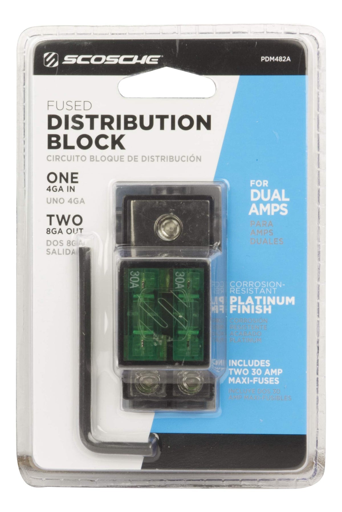 One 4GA Input, Two 8GA Outputs | Includes Two 30 Amp MAXI Fuses | Designed for ease-of-installation | Corrosion Resistant Platinum Finish and ABS Cover | Backed by Scosche's Limited Lifetime Warranty and Lifetime Tech Support