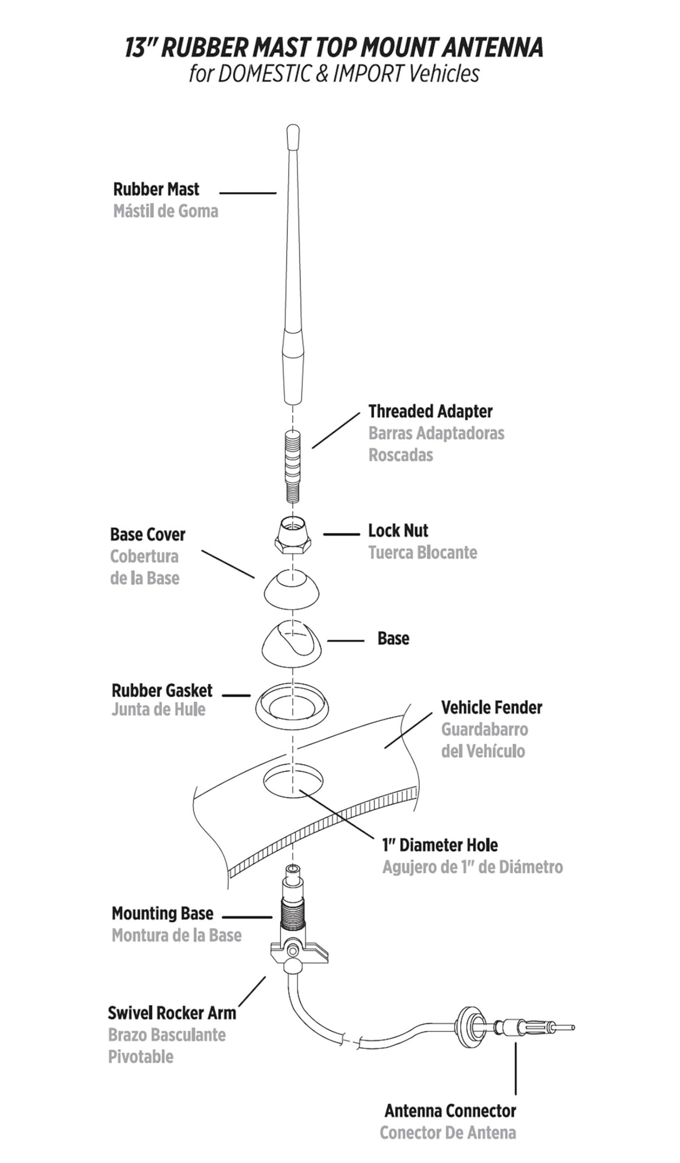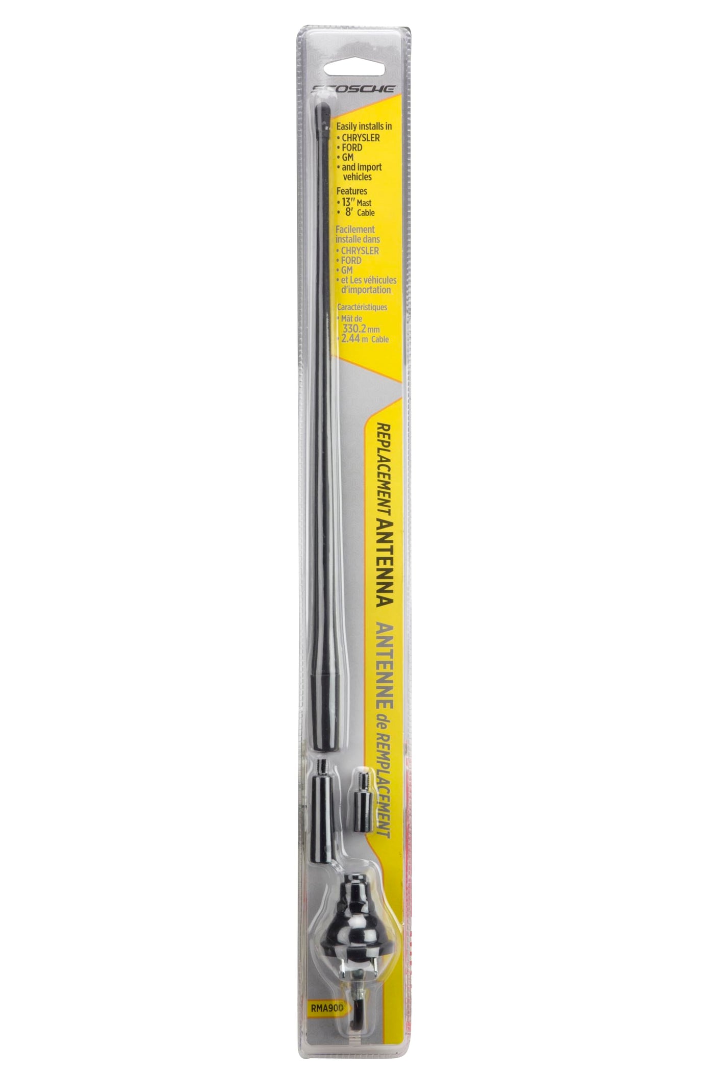 Enhance your driving experience with the Scosche RMA900 Top Mount Antenna, a 13� universal rubber vehicle mast designed for superior performance and durability. This replacement car antenna is perfect for those seeking a reliable upgrade to their factory-installed options. Its universal design makes it an excellent fit for cars, trucks and SUVs, making it an essential accessory. A versatile choice, the RMA900 delivers clear AM/FM signals. This antenna offers a straightforward installation, ensuring that even those without advanced mechanical skills can set it up effortlessly. With its robust construction, this car radio antenna replacement withstands harsh weather conditions while maintaining a stable connection�an ideal feature for both everyday commutes and long journeys. The marine-grade Rubber not only ensures long-lasting use but also adds an elegant touch, making it a standout addition to any vehicle. For those in search of a universal antenna or a replacement car antenna, the Scosche RMA900 stands out in quality and functionality. This top mount antenna not only enhances signal reception but does so with style and durability unmatched by other products in its category. Invest in this high-quality auto antenna replacement and enjoy a significant upgrade in your car's connectivity capabilities today.