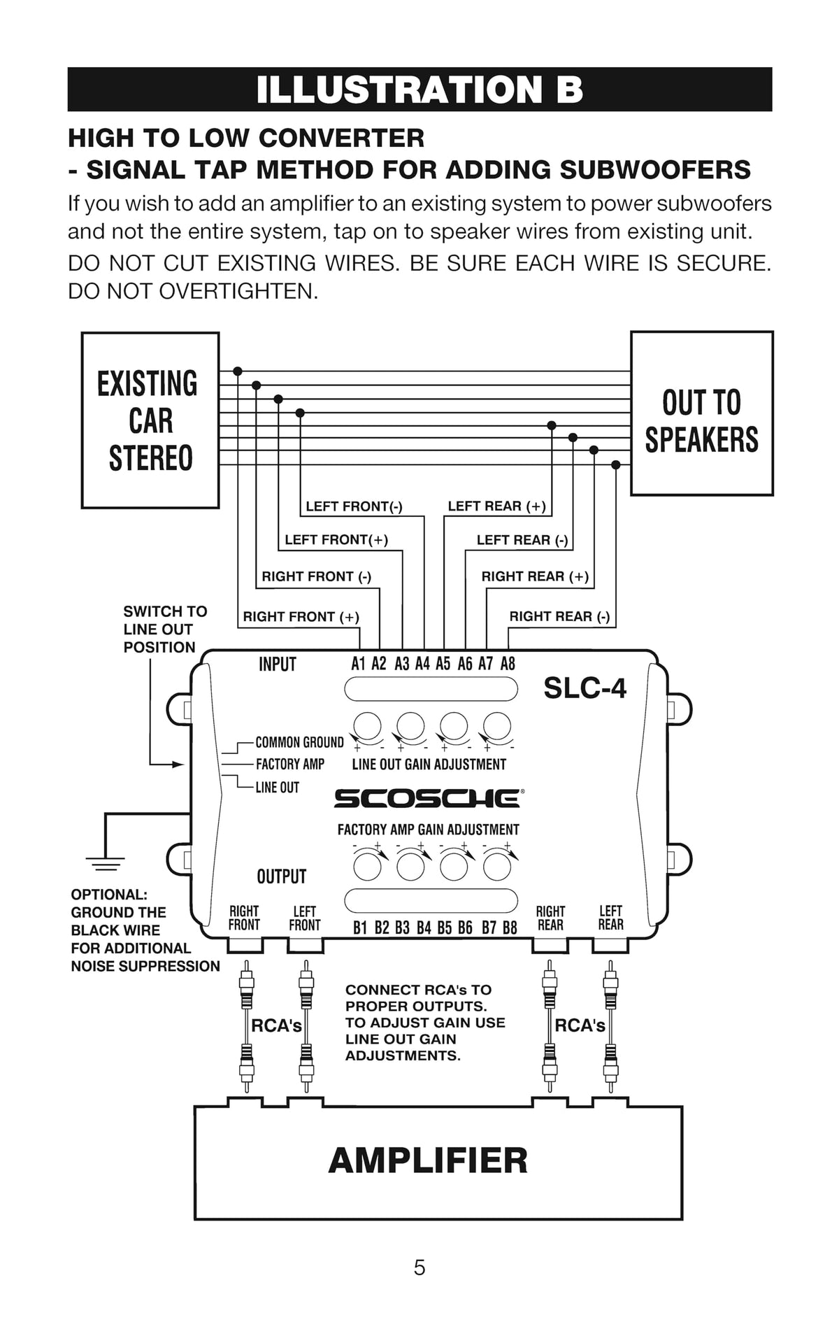 DescriptionThe Scosche SLC4 4-channel adapter line out converter for car stereo audio allows you to connect a receiver with no pre-amp outputs to an amplifier without speaker-level inputs. The SLC4 handles a speaker-level signal up to 80 watts RMS per channel, then converts it to a line-level signal you can plug into your amp's input. This speaker wire to RCA speakers converter is compatible with high power car stereos up to 80 watts per channel. Perfect for fast installation when adding a subwoofer to your factory car stereo system for a new sound experience.
