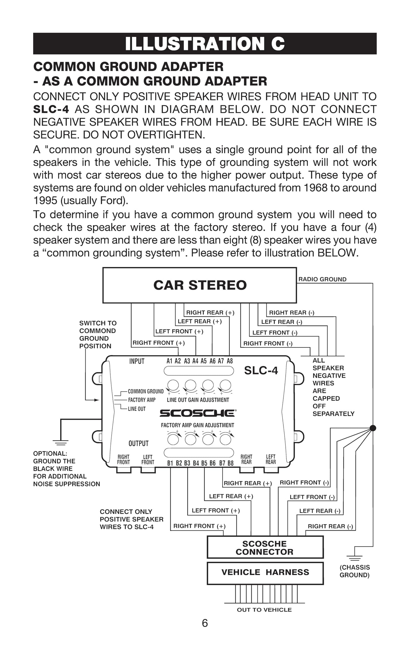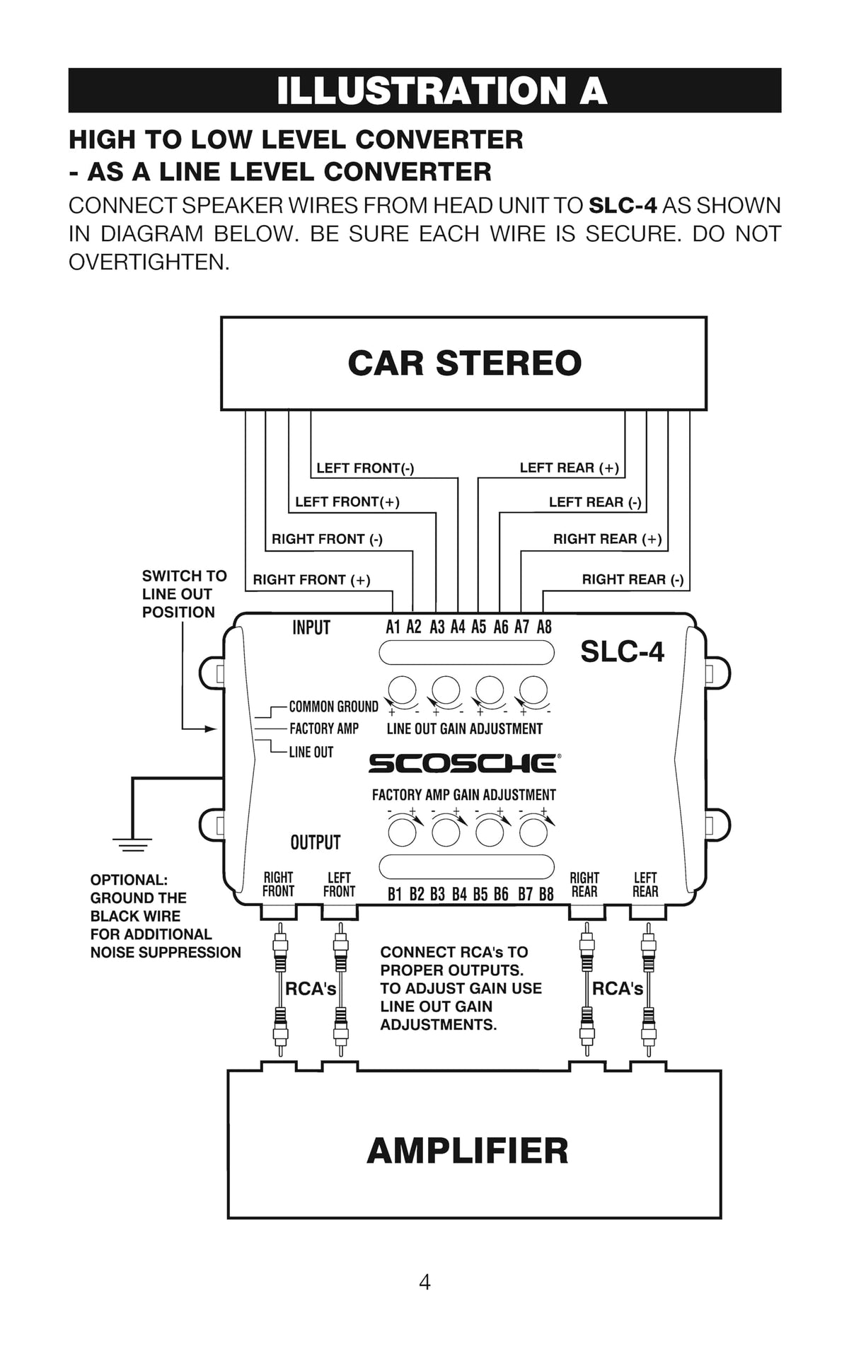 Scosche SLC4 Line Output Converter/OEM Premium Amplifier Adapter 4CH LOC High/Low RCA Converter Car Audio Add New Amp or Retain Factory Amp Line Level Converter for Car Stereo Quality Sound