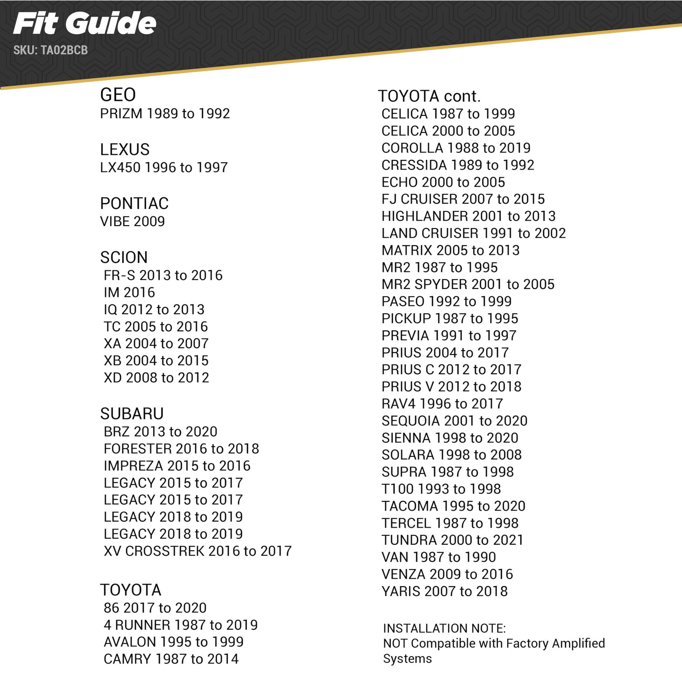 For over 40 years, Scosche has been producing high quality, affordable Car Stereo Installation Dash Kits, Vehicle Wiring Harnesses, Antenna Adapters, Radio Replacement Interfaces, Amplifier Wiring Kits, Cables and other 12V installation accessories. We know how you feel about your vehicle, so we will not design, engineer or deliver a product that does not meet our extremely high standards. When you purchase a Scosche installation accessory, we have you covered.We offer Lifetime Tech support which means our knowledgeable tech team is available to answer any product questions you may have for as long as you own the product. We are so confident in our product quality that we back all Scosche 12V installation accessories with a Limited Lifetime Warranty.[Not Compatible With Factory Amplified Systems]GEO: Prizm 1989- 1992, LEXUS: ES250 w/Cassette Player 1990- 1991, LS400 1990- 1992, LX450 1996- 1997, SCION: FR-S 2013- 2016, IM 2016- 2016, IQ 2012- 2015, TC 2005- 2015, XA 2004- 2006, XB 2004- 2015, XD 2008- 2014, SUBARU: Ascent 2019- 2020, BRZ 2013- 2019, Forester 2016- 2018 Non Amplified, Impreza 2015- 2016 Non Amplified, Legacy 2015- 2017, Outback 2015- 2017, XV Crosstrek 2016- 2018 Non Amplified, TOYOTA: 4Runner 1984- 2018 Non Amplified, 86 2017- 2020, Avalon 1995- 1999 Non Amplified, Camry 1983- 2006, Camry 2007- 2017 Non Amplified, Celica 1982- 2005, Corolla 1983- 2019 Non Amplified, Corolla 1988- 1992 SR5 Coupe, Corolla FX16 1987- 1988, Corolla IM 2017- 2018, Cressida 1981- 1992, Echo 2000- 2005, FJ Cruiser 2007- 2015 Non Amplified .