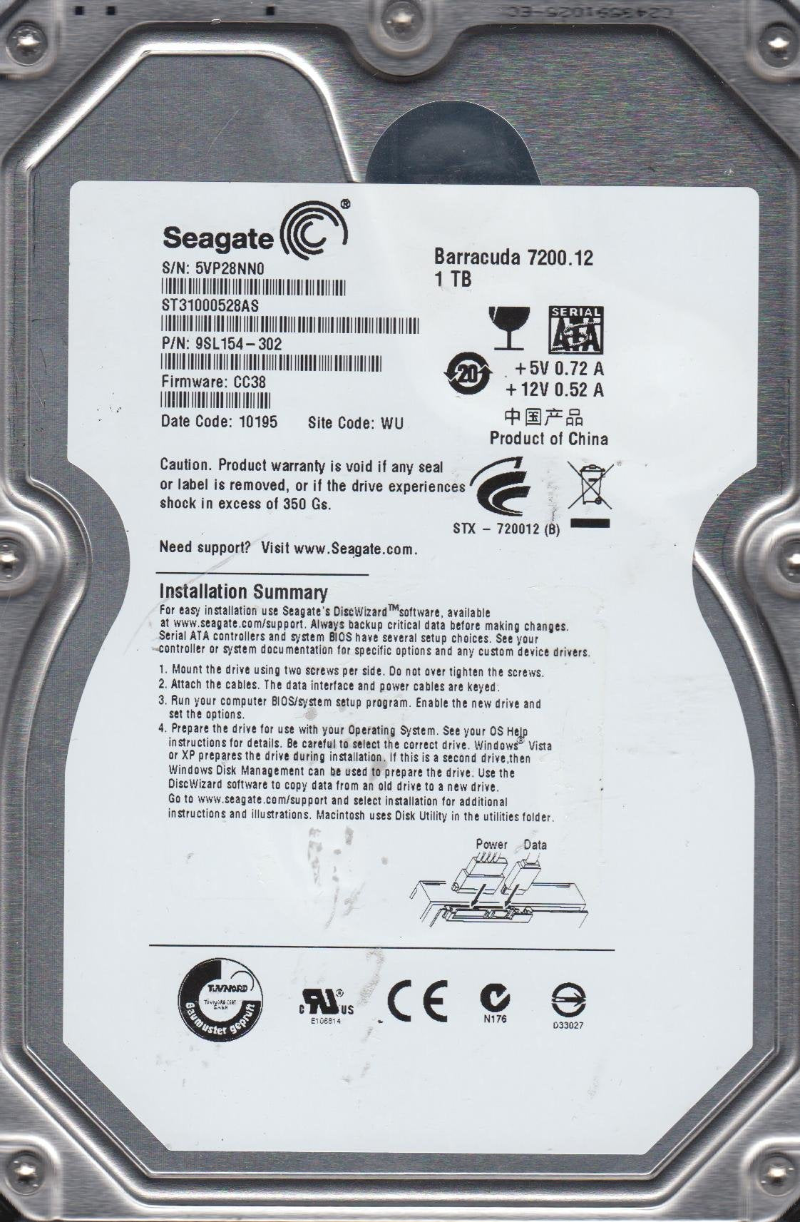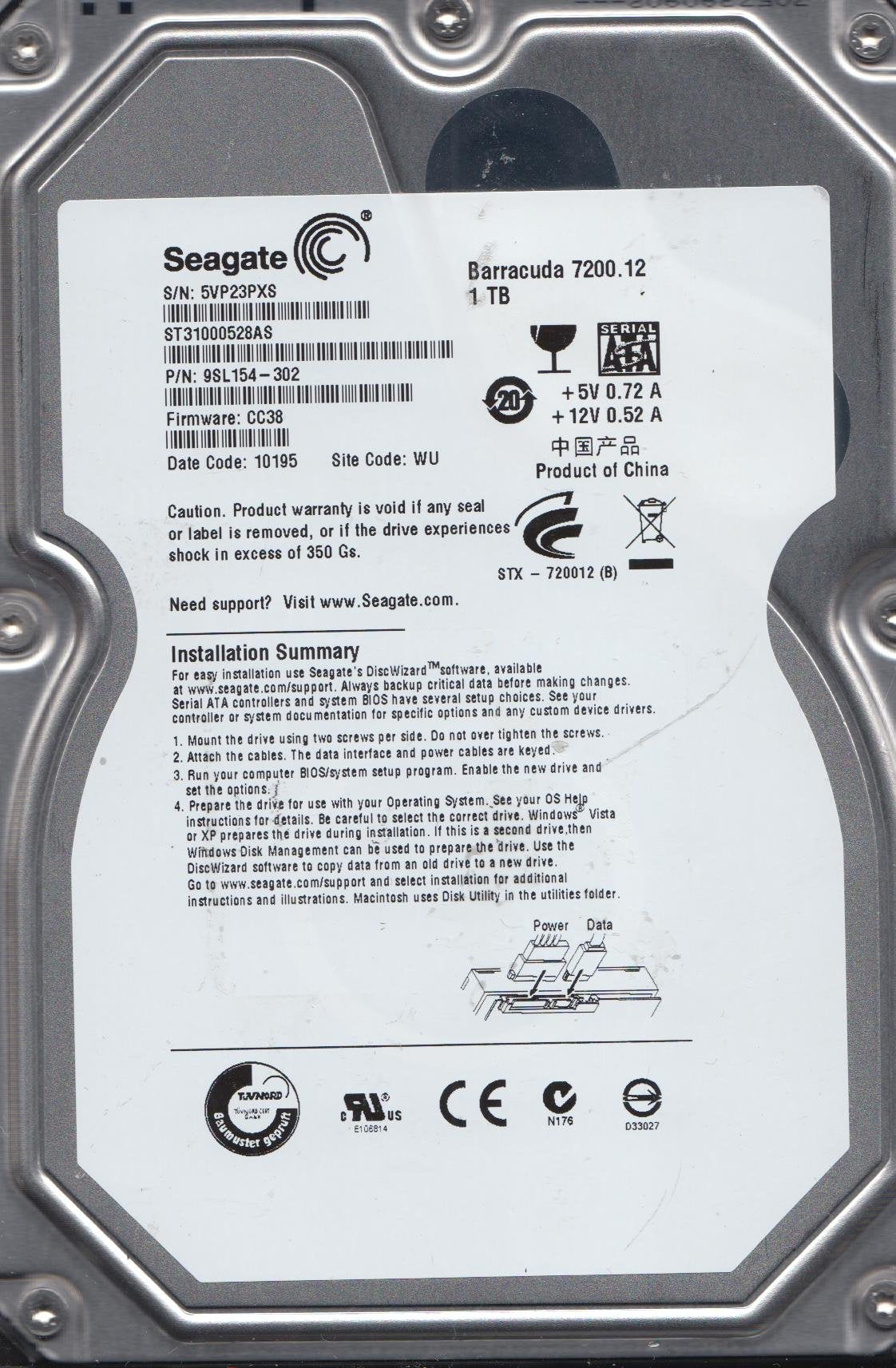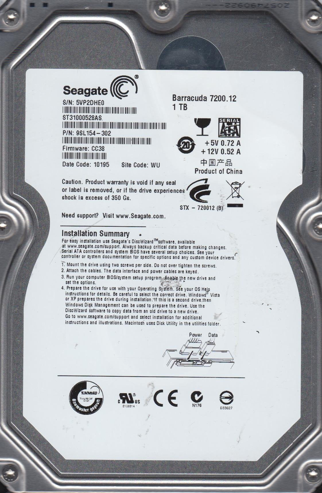 HDD with Serial Number: 5VP3VTBD Model: ST31000528AS Part Number: 9SL154-302 Firmware: CC38 Date Code: 10297 - 20 Jan 2010 Site Code: WU Product of: China PCB Sticker: 4778 M PCB Revision: 100536501 REV A Physical Heads map: 00 01 02 03 Preamp Type: 71 23