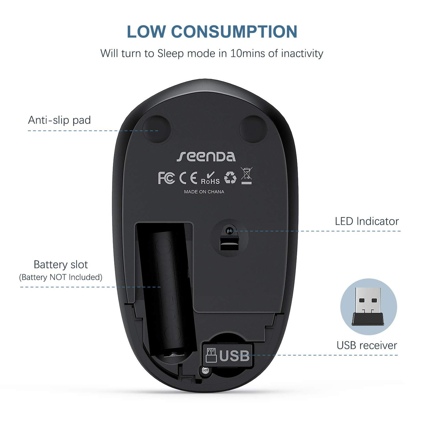 Seenda 2.4G Wireless Mouse -- Features Advanced 2.4G Wireless Technology That Ensures Reliable Connection Up To 33Ft. Sleek Design With Noiseless Clicking, Keeps You Focused On What You Are Working On Without Disturbing Others. Wireless Mouse With Noiseless Clicks Quiet Clicks Free Your Worry About Bothering Other, And Keeps You Focused On What You Are Working On Portable & Compact Size If You Travel A Lot For Work, This Slim Mouse Would Be The Best Partner For Your Business Trip, Thanks To The Compact Design, It Can Be Easily Put Into Your Bag Or Even Pocket Plug & Play Super Easy Installation No Other Drivers Or Codes Needed, Simply Plug The Nano Usb Receiver To Your Computers Usb Port And It Will Get Be Ready For You Automatically Low Power Consumption The Mouse Will Turn To Sleep Mode In 10Mins Of Inactivity For Energy Saving, And Can Be Activated By Clicking Any Buttons Package Include (No Battery Included): 1 * Wireless Mouse 1 * Usb Receiver (Placed Inside Of The Mouse) 1 * User Manual