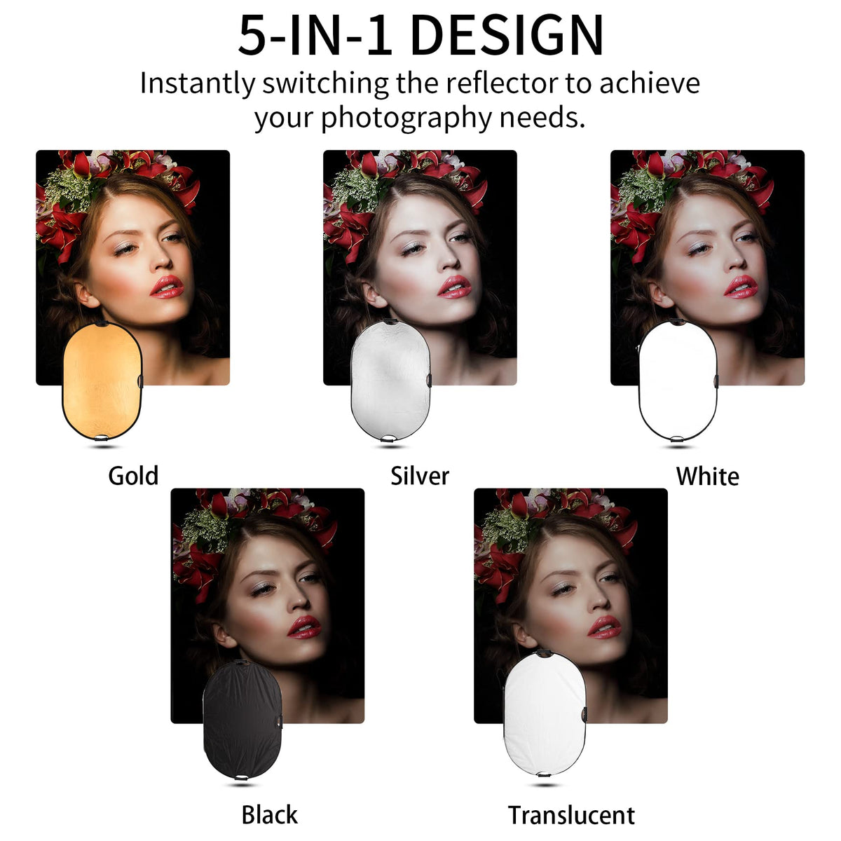 Feature: 5-In-1 24X36 Inch (60X90Cm) Portable Handle Oval Reflector Comes With Silver, Gold, Black, White And Translucent Surfaces. The Reflector Is Easy To Be Folded Into A Carry Pouch,Collapsed Size : 15 Inch(35Cm) Round. The Reflector Holder Arm Has A Strong Built Inside Making It Ideally Suitable For Holding A Collapsible Reflector. Just Attach The Reflector To The Stand Via This Clamp, Perfect For Positioning Your Reflectors. Specification: The Light Stand Folded Height: 27.5 Inch(70Cm),Maximum Height: 78.7Inch(200Cm) The Reflector Holder Arm Telescopic Length: 21.65-53.15Inch(55-135Cm) Package Include: 1 X 5-In-1 Reflector With Carrying Bag 1 X Light Stand 1 X Reflector Holder Arm