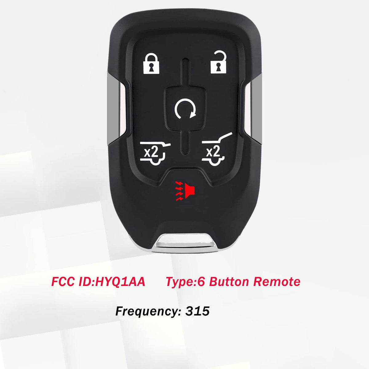 Product Description: Specification: Fcc Id:Hyq1Aa&Nbsp; Type:6 Button Remote Frequency: 315 Mhz Compatible Vehicles: 2015-2020 Chevy Suburban 2015-2020 Chevy Tahoe&Nbsp; 2015-2020 Gmc Yukon&Nbsp; 2015-2020 Yukon Xl Features: 1.The Remote Key Includes Key Housing, Circuit Board, Battery, And Chip. Without Logo. 2.The Remote Key Made Of Quality Plastic Material, It Is Firm, Antiwear, And Durable To Use. Wonderful Replacement For The Old Or Broken Auto Key. 3.Precision Manufacturing Has High Sensitivity, Easy To Operate. 4.Youll Need To Program The Key At A Local Automotive Locksmith Before Using It. Important Note: 1.You Need To Go To Your Local Dealer Or Locksmith Shop To Cut The Key And Program To Your Car, Locksmith Should Charge Less Than The Dealer. Package Content: 1 X Remote Car Key