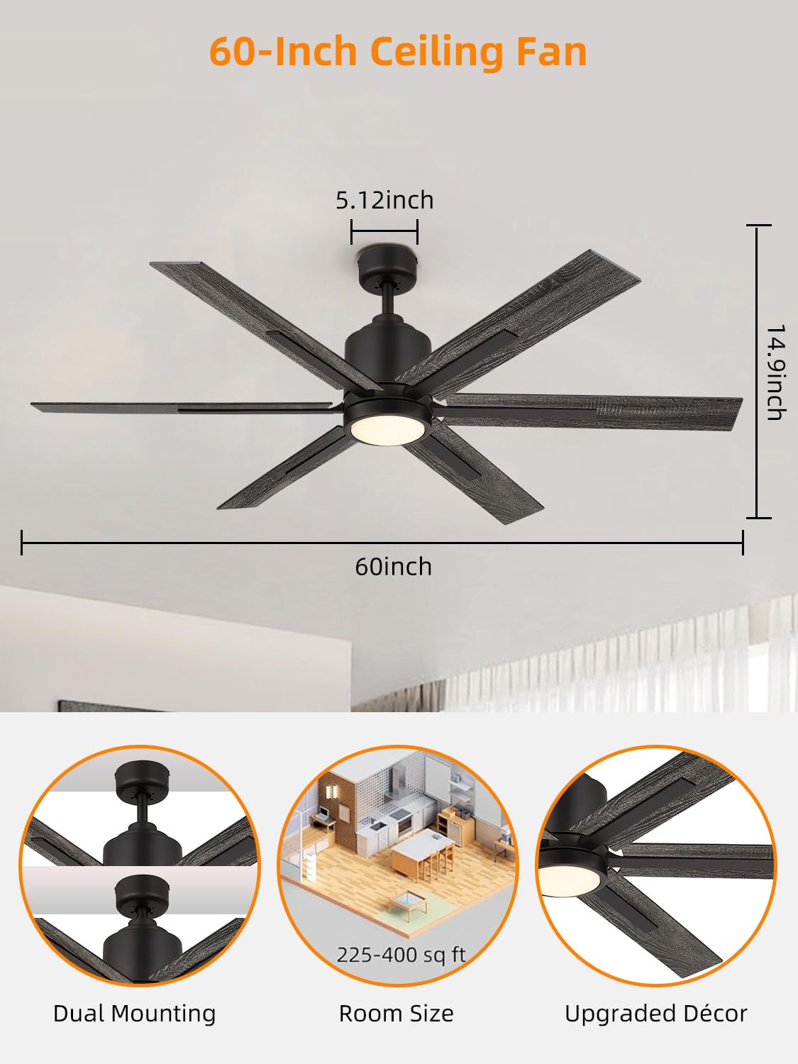 60 Inch Ceiling Fan With Light And Remote, Farmhouse Ceiling Fan With Light, Large Industrial Ceiling Fan For Living Room, Dining Room, Reversible Dc Motor, 6 Speed, Black Bronze