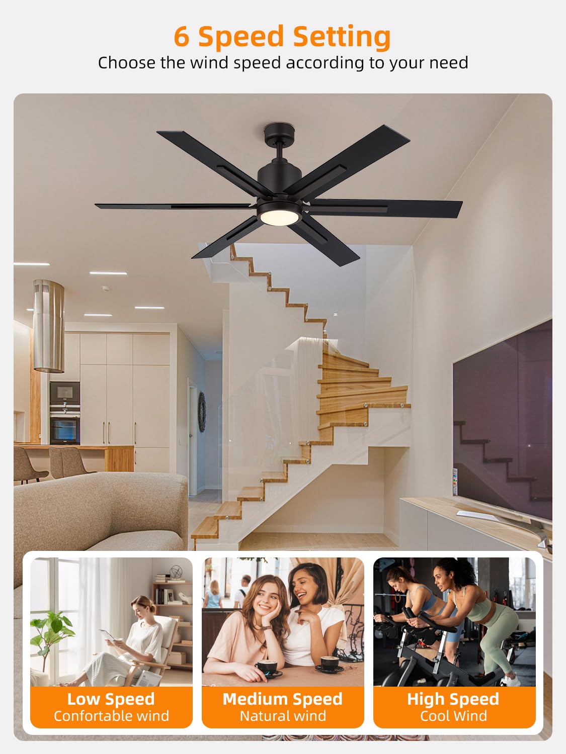 Q: What are the speed options available for the fan?A: This ceiling fan features six-speed options, enabling you to customize the airflow to your preference, whether you want a gentle breeze or a stronger gust.