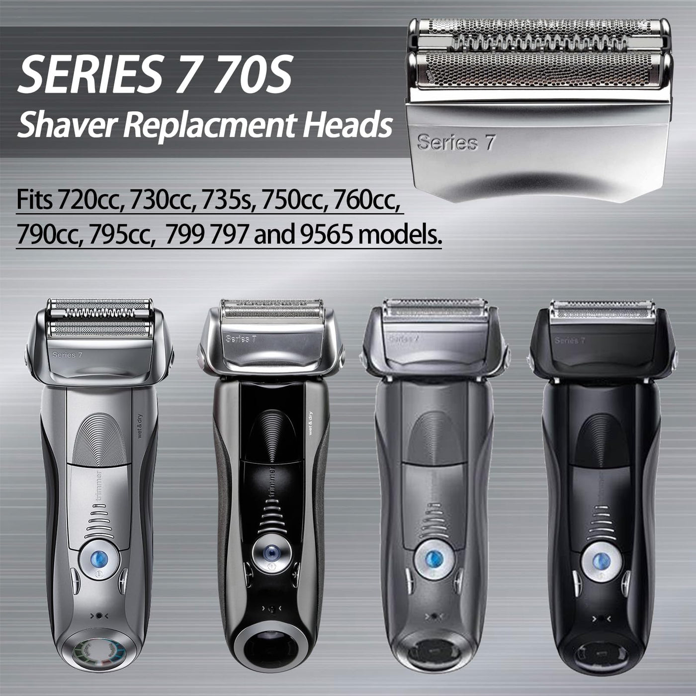 Q: What Series 7 models are compatible with the 70S Foil & Cutter replacement heads?A: The 70S Foil & Cutter replacement heads are compatible with various Series 7 shavers, including models 720cc, 750cc, 760cc, 790cc, 795cc, 797, 799, and others.