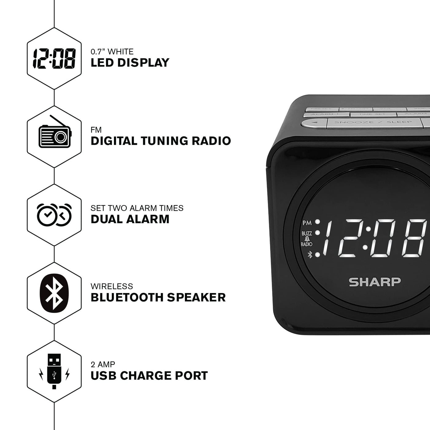 HIGH QUALITY BLUETOOTH SPEAKER AND DIGITAL FM RADIO: Use as a Bluetooth Speaker to stream your favorite music wirelessly from Spotify, Apple Music or Pandora straight from your Smartphone or Tablet. Since it also includes a FM radio, tune to an FM Radio Station and set your favorites with up to 10 FM presets. Great sound and tone, especially for it�s size. Solid construction, high-quality materials and speakers create a quality product which will look and sound great in your home.|FALL ASLEEP TO MUSIC / WAKE TO MUSIC: Sleep timer function lets you fall sleep to the radio by setting the sleep timer to play while you fall asleep. The Radio Alarm Function allows you to wake to your favorite FM station!|HIGH SPEED USB CHARGE PORT - 2 AMP USB Rapid Charge Port - Charge Quickly! Most conventional USB charge ports are 1 amp. Having 2 amps means more power, faster charge times and gives you the option to charge more powerful devices. Faster!|DUAL ALARM FUNCTION with SNOOZE: Set two separate Alarm times Set two alarm times; for example, set one alarm for the weekday and the other for the weekend. You can clearly see when the alarm is active when the alarm indicator is lit on the display. If you need a little extra sleep, this clock features a 9 minute snooze function. All controls are on the top of the clock for easy access.|ELECTRIC POWERED with �NO WORRY� BATTERY BACKUP: Plug into standard household wall outlet to power the clock radio. Battery Backup (Requires 2 x AAA batteries (not included)) This clock is electric operated; The battery backup is used for storing the time and alarm settings if the power is interrupted. During battery backup the clock�s display will not be lit. Once the power is restored the display will re-light.|BEAUTIFUL DESIGN, SOLID CONSTRUCTION AND ROOM FILLING SOUND: The Sharp SPC729AMZ Clock Radio with Bluetooth Speaker is the perfect device to stream your favorite music wirelessly from straight from your Smartphone or Tablet. You can also simply tune in to your favorite FM Radio Station and save them with up to 10 FM presets. Enjoy high quality sound performance thanks to the quality Bluetooth speaker and high-end design and construction.