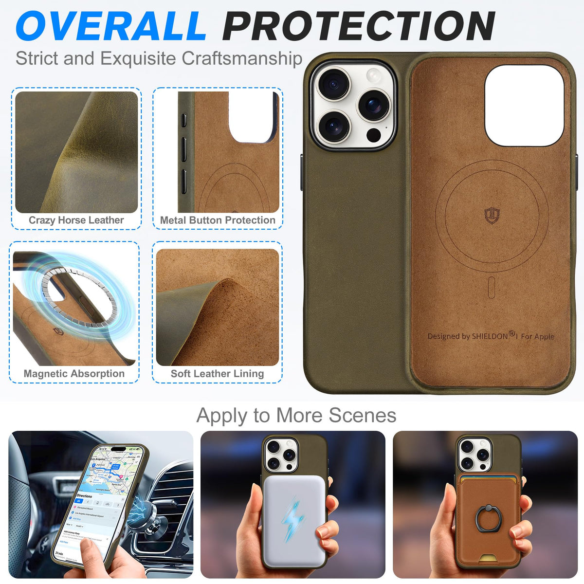 Shieldon Case For Iphone 16 Pro, Crazy Horse Top Grain Leather Magnetic Wireless Charging Shock-Absorbent Anti-Scratch Non-Slip