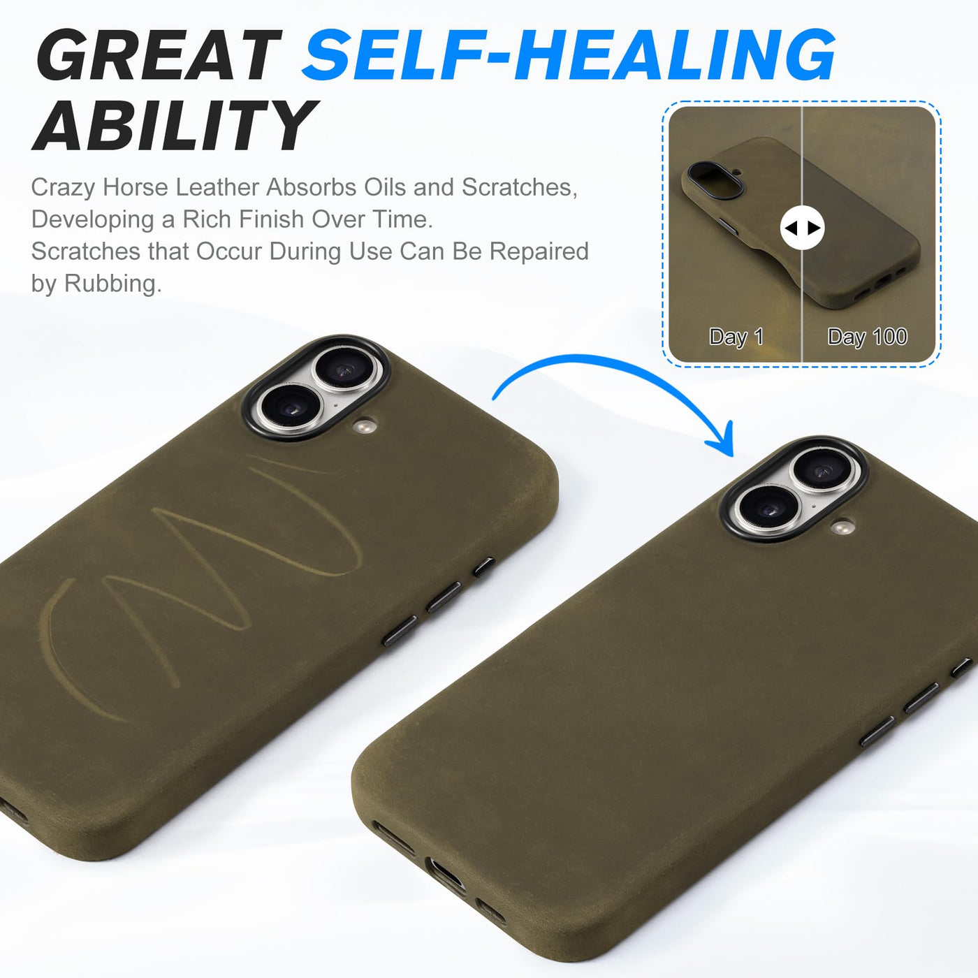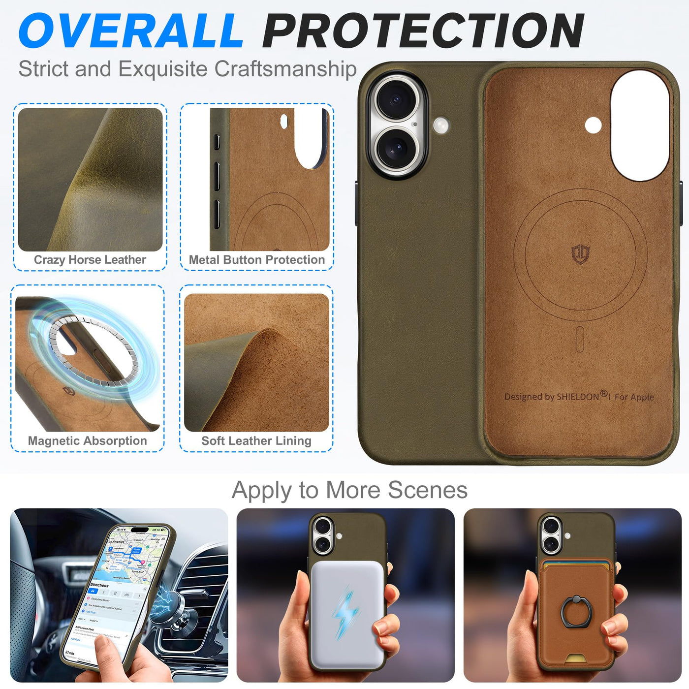 Shieldon Leather Case For Iphone 16 6.1'', Crazy Horse Top Grain Leather Magnetic Wireless Charging Slim Anti-Scratch Non-Slip S
