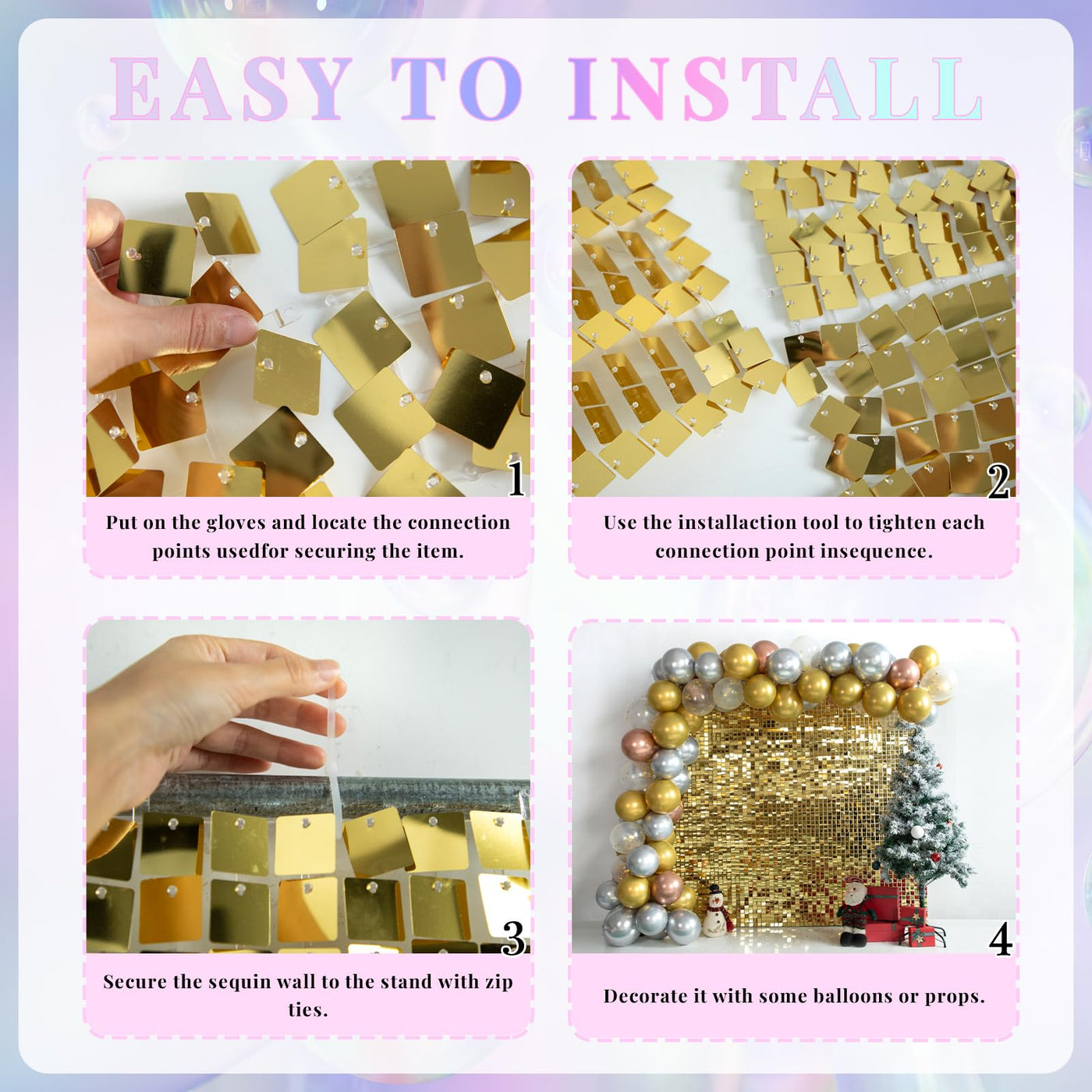 Q: How easy is it to install the shimmer wall backdrop?A: The installation is straightforward, as each panel comes with snaps on the sides that allow you to splice them together. The package includes zip ties and gloves for added convenience during setup.