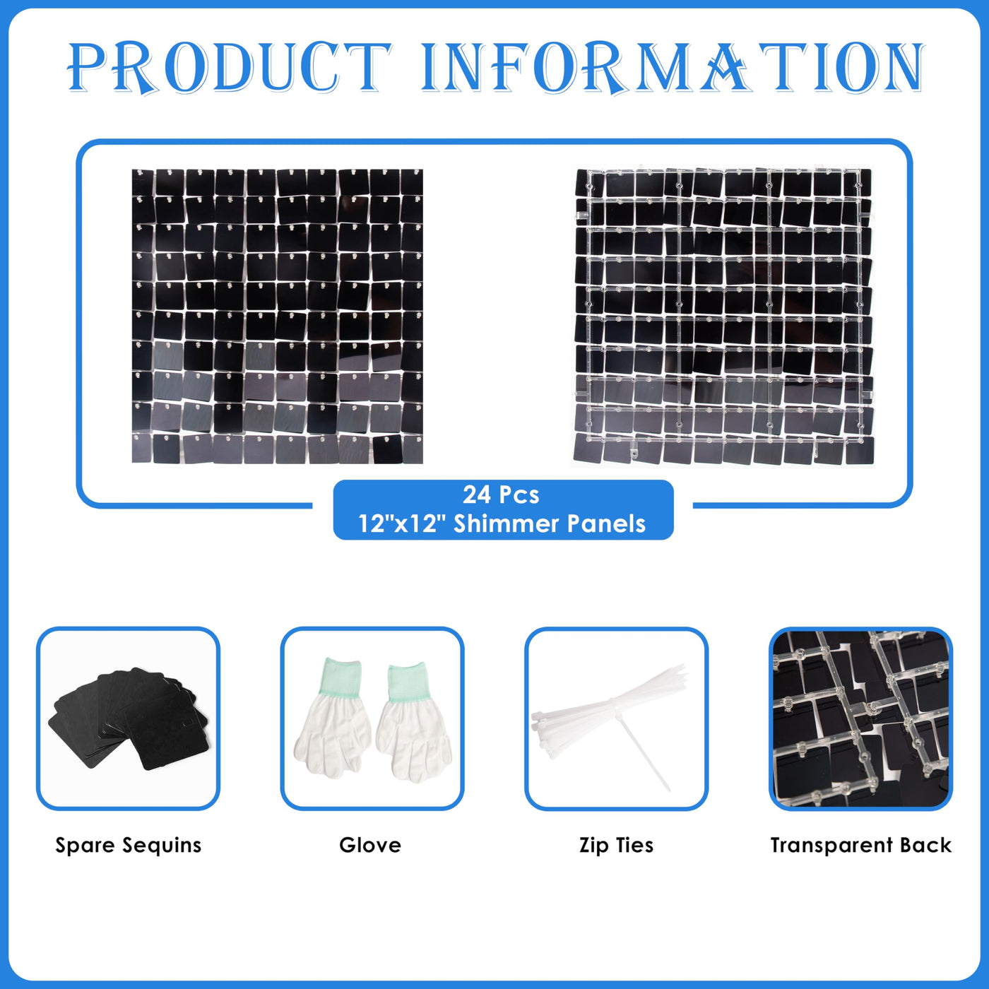 Q: How many panels are included in the package?A: Each package comes with 24 pieces of 12"x12" sequin panels, along with matching assembly materials such as gloves, zip ties, and spare sequin pieces.